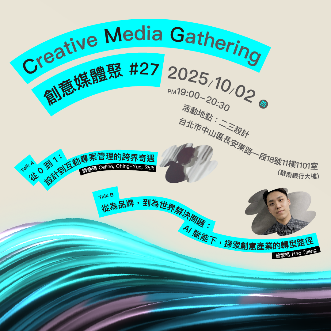 Creative Media Gathering #27 講座,分別由師靜筠(Celine, Ching-Yun, Shih)與曾繁皓(Hao Tseng)帶來的兩段精彩分享。本篇節錄由曾繁皓帶來的分享,關於如何請團隊成員使用 AI 製作客戶的影片、Hao 對 vibe coding的觀察、以及自己興起想要創造更多價值的念頭。