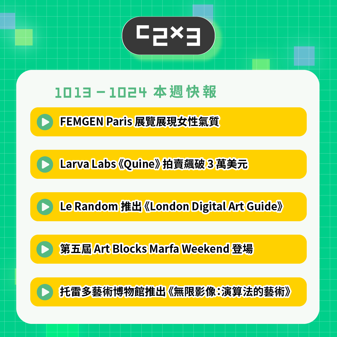 🔹 FEMGEN Paris 展覽展現女性氣質 🔹 Larva Labs《Quine》拍賣飆破3萬美元🔹 Le Random 推出《London Digital Art Guide》🔹 第五屆 Art Blocks Marfa Weekend 登場🔹 托雷多藝術博物館推出《無限影像:演算法的藝術》