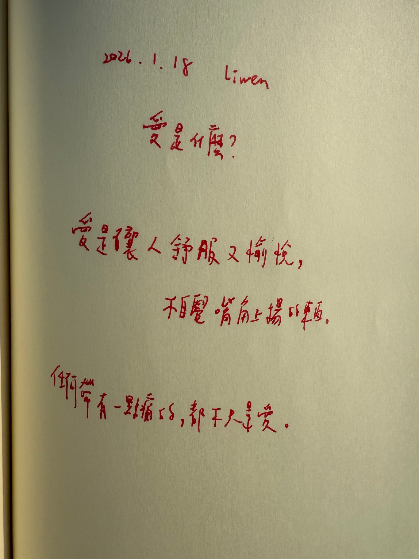 我買了一包有寫字的煙 2026.1.25 1. 真討厭更新。 更新之後手指好笨,打字都像肢體有障礙一樣。 2. 集體恐懼多龐大?一個人一點聚集成龐大的黑霧,然而那個男人站上台北101自拍,戰勝集體恐懼,想一想,他好厲害。 而我也看見演算法的厲害,全部都在說這個男人,一個人的力量如此之大,一個人的堅定有時候可以戰勝整團黑霧。 這就是屬於每個人…