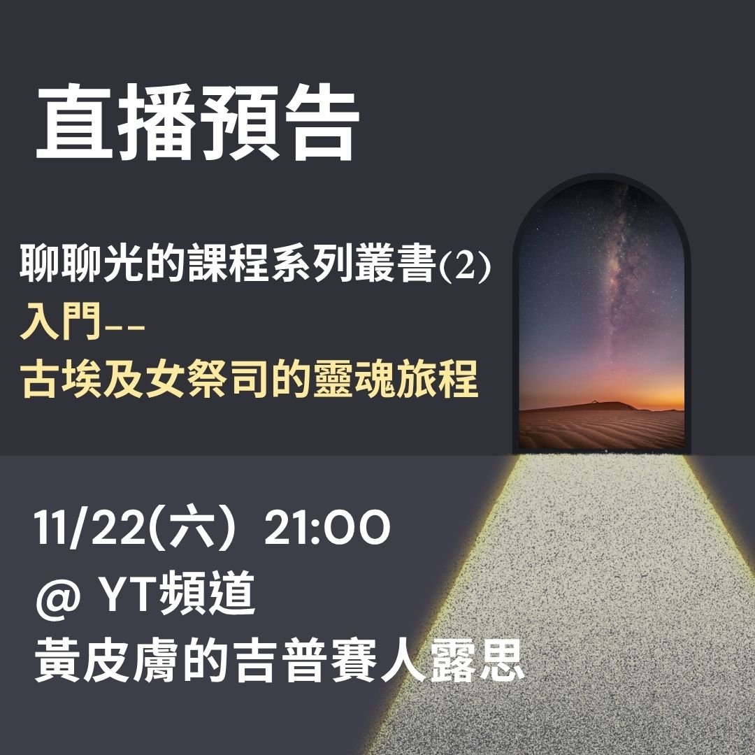 11/22(六)21:00,我將在YT直播帶你深入《入門—古埃及女祭司的靈魂旅程》最關鍵的篇章!作者自幼與世界格格不入,那個神秘的「HE」從小便在她腦中響起,究竟是誰?為何與她靈魂的呼喚緊緊相連?剛好落在「太陽藍夜」這個直覺力爆棚的好日子,一起來揭開這段神秘旅程的核心秘密。