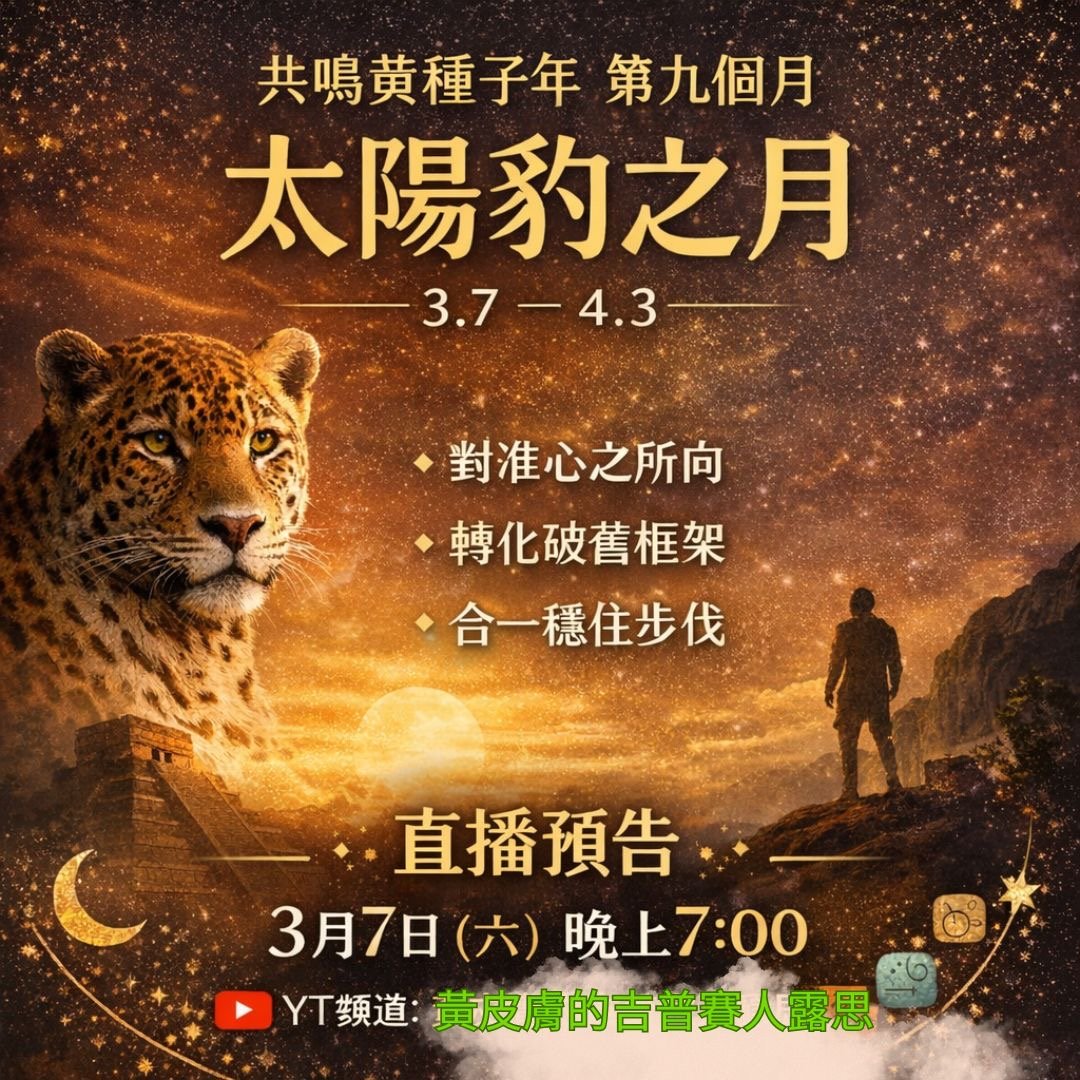 我們正式進入共鳴黃種子年的第9個月份—太陽豹之月(2026/3/7–4/3),這是一段關於「活出心之所向」的時間。在行動之前,先對準內在的意圖;在破壞與重整之中,看見真正屬於自己的方向。從藍風暴的清理、黃人的觀點轉化,到紅蛇回歸身體,本月邀請我們心腦合一、穩住步伐,準備好在屬於自己的舞台上發光。