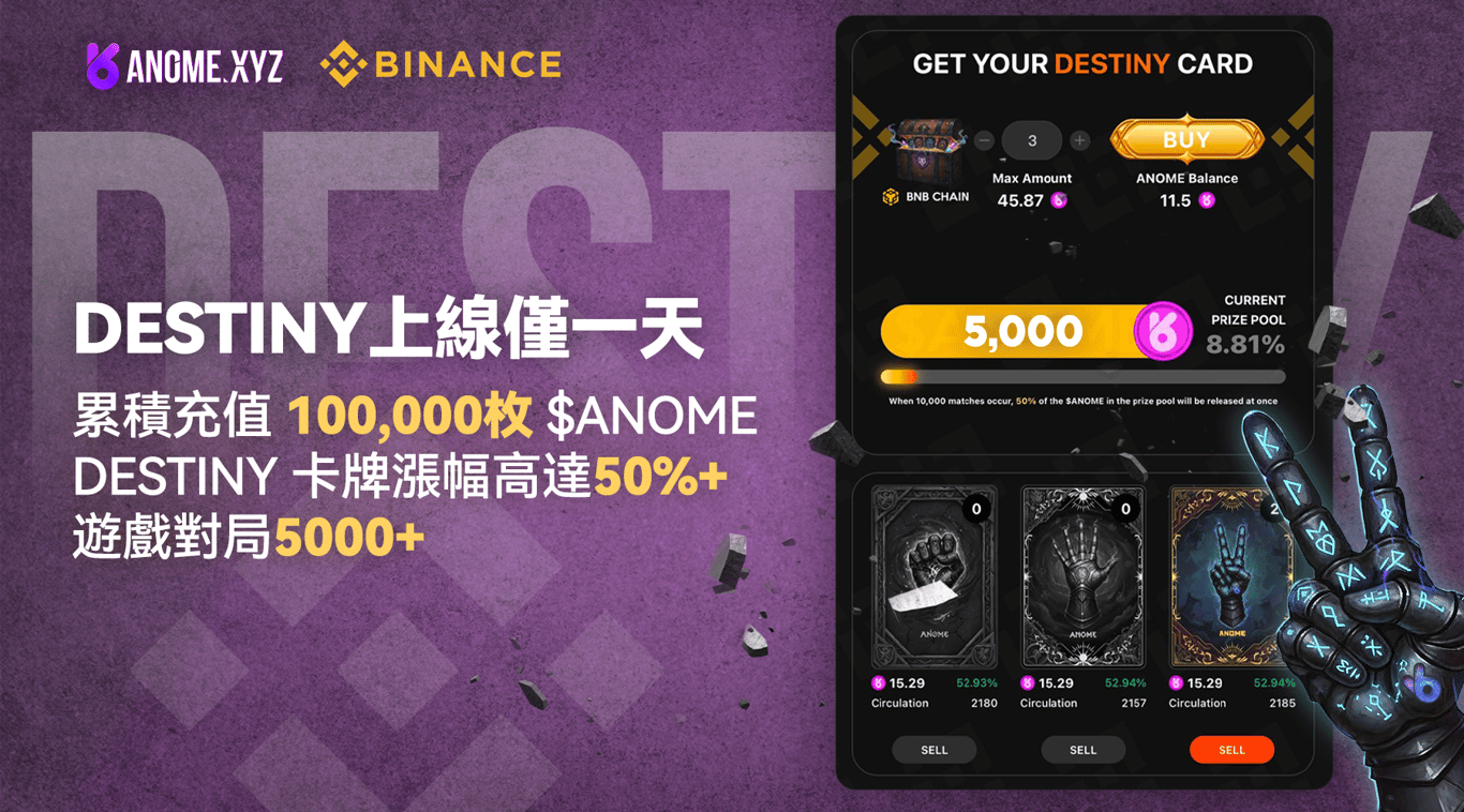 ANOME「Destiny」游戏正式上线BSC Chain:卡牌涨幅+55%!