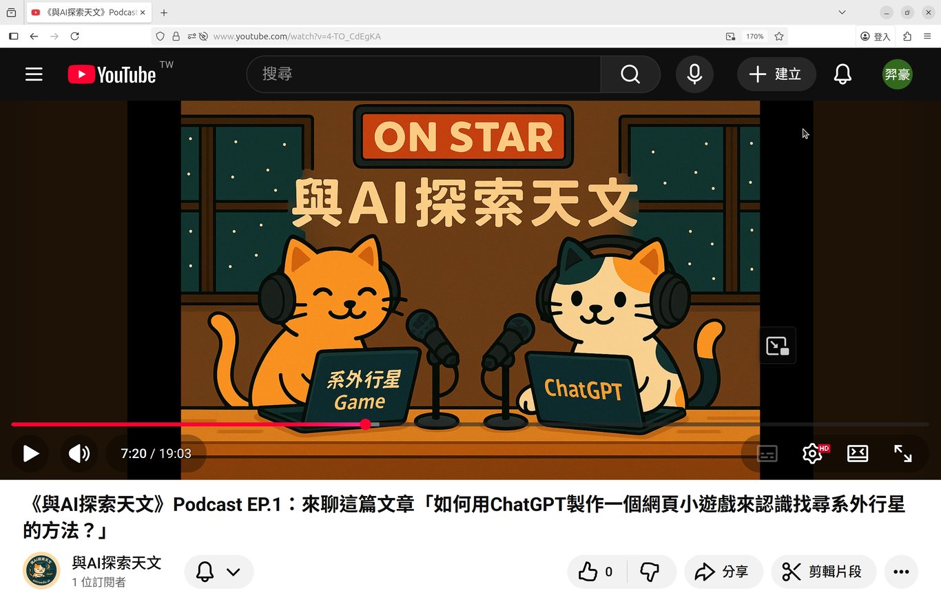 第一個影片以AI工具NotebookLM生成兩人對談的Podcast,討論我之前寫的文章《如何用ChatGPT製作一個網頁小遊戲來認識找尋系外行星的方法?》,並解說各種尋找系外行星的方法,以及AI如何協助我們創造專屬個人的天文知識探索旅程。歡迎按讚、訂閱、開啟小鈴鐺並分享^^ (封面是用ChatGPT產生) 《與AI探索天文》Podcast EP.1 youtu.be/4-TO_CdEgKA 《與AI探索天文》YouTube頻道 www.youtube.com/@ast...