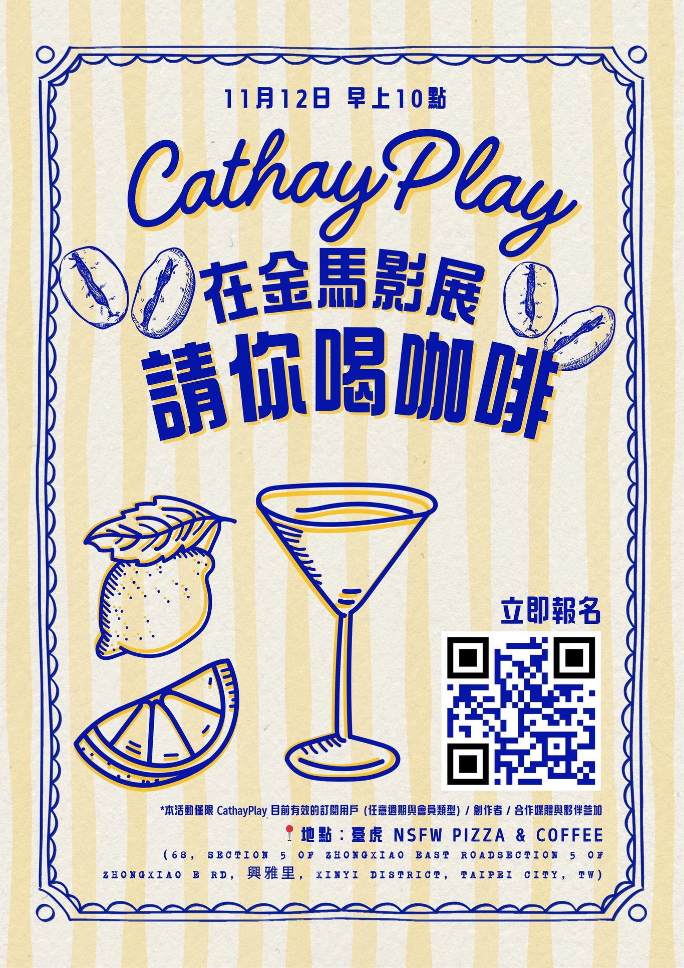 🎬 CathayPlay 在金馬 · 台北相約時刻 這個十一月,CathayPlay 將在 台北金馬影展 舉辦一場線下聚會, 邀請平台的 會員、創作者,以及合作媒體與夥伴 一起來喝杯咖啡、聊聊電影。☕️ 我們想在電影的季節裡,與熟悉的朋友再次相約,也認識新的影迷夥伴。 📍 地點:臺虎 NSFW Pizza Coffee 📅 時間:2025年11月12日 早上10點 - 11點 👥 對象:CathayPlay 有效訂閱用戶(任意週期與會員類型)/創作者/合作媒體與…