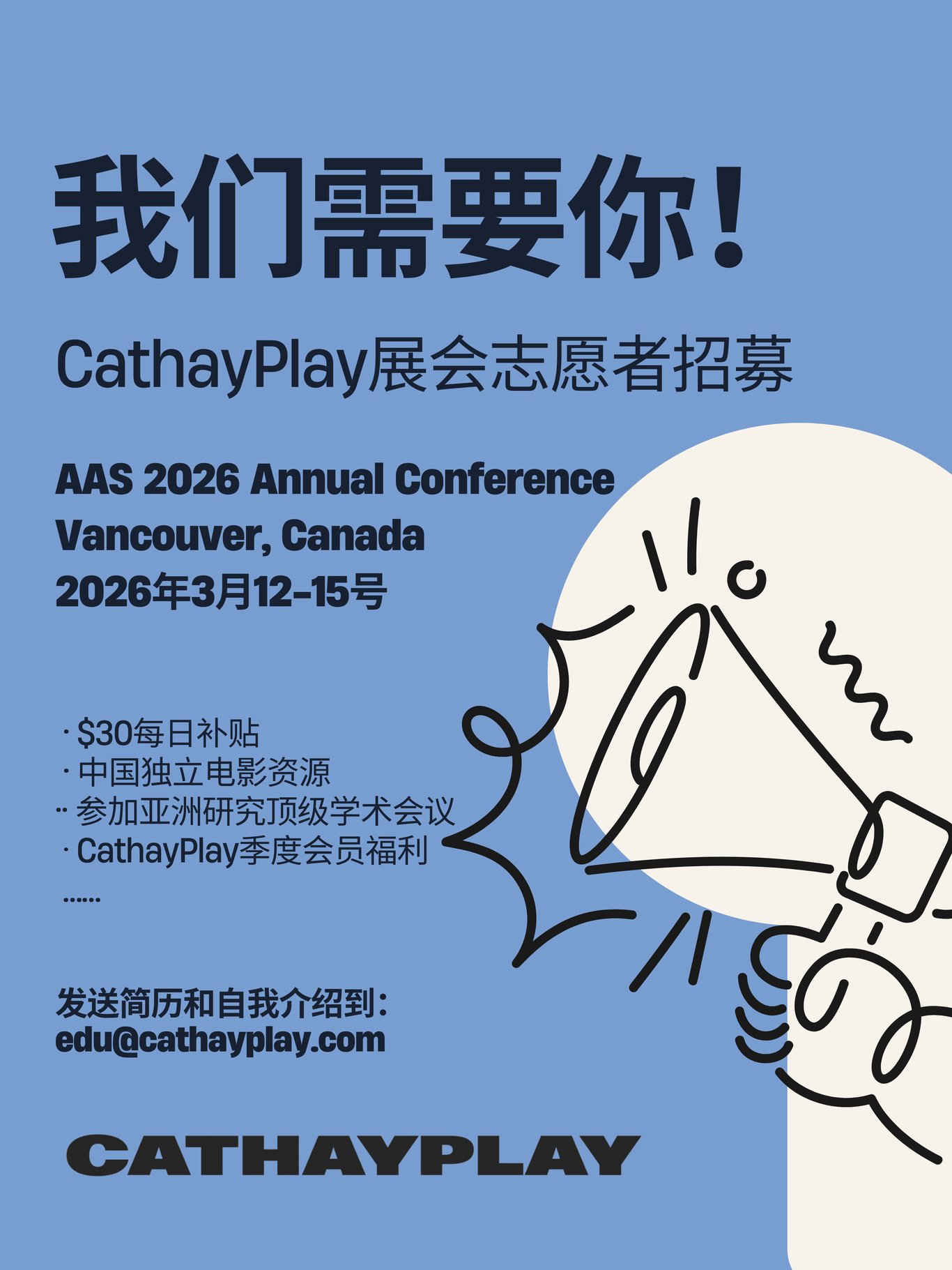 CathayPlay 展會志願者招募公告AAS 2026 Annual Conference 加入我們的志願者團隊,與 CathayPlay 一起,在 AAS 2026 展會上展現你對電影的熱情!CathayPlay 是一個致力於發行和推廣華語獨立電影的串流媒體平台,提供多元豐富的華語電影體驗。我們現在正在招募志願者,邀請你與我們一同在教育領域分享這份文化藝術的熱情。 地點:溫哥華(Vancouver, Canada)工作時間:2026 年 3 月 12–15 日 主要職責: 展…