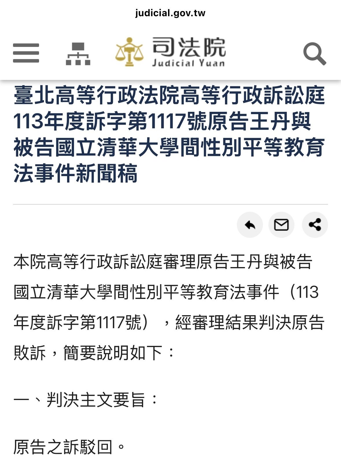 2023年台湾MeToo浪潮期间,六四学运领袖王丹遭多人指控性骚扰。台湾清华大学性别平等委员会针对其中一起展开调查,认定性骚扰成立,并依规定作出辅导与教育处分。王丹不服,提起行政诉讼;台北高等行政法院于2025年11月6日判决其败诉。