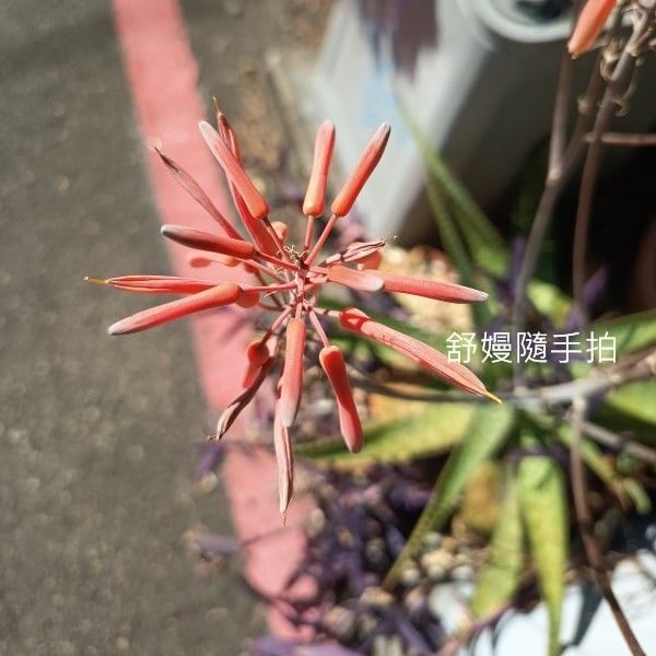 巷口這盆蘆薈花開艷紅,靚麗,停下腳步,觀看幾分鐘。 另一過路人說:蘆薈開花,水噹噹。 沒錯,小時候,大人說敷蘆薈葉片中的凝膠對皮膚曬傷或有疤痕恢復效果好。 鄰居魏小姐告訴我媽媽,蘆薈的凝膠煮湯喝,對胃好。 我媽媽種了幾大叢蘆薈,非常用心照顧, 養的葉片十分肥厚再取蘆薈那滑溜溜的肉和豬肉絲燉湯讓老爹喝了顧胃。 我吃過咕溜咕溜…