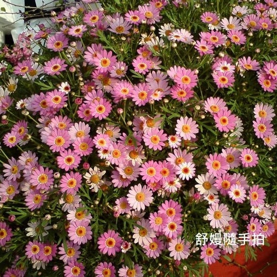洗衣店前密集盆栽群中,這盆花朵呈粉紅色, 花心為黃色,顏色鮮豔的小菊花非常美麗,才說這雛菊……。 立刻被糾正:那嘿是瑪格麗特,不要張冠李戴。 唉哟,說成語耶,還張冠李戴哩。 據說:十六世紀挪威的公主Marguerite, 十分喜歡這種清新脫俗的小白花,所以就以自己的名字替花卉命名。 在西方,瑪格麗特也有「少女花」的別稱,除了小巧可人的外型,清新脫俗的配…