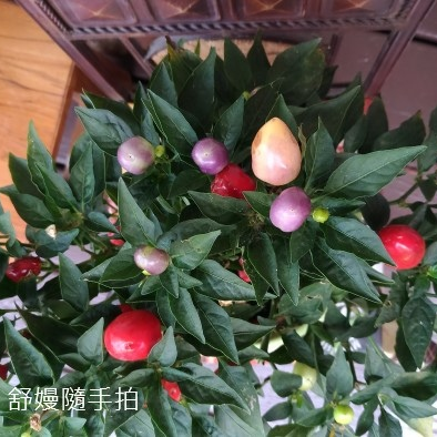 隱形眼鏡店的老闆應該很愛花。 每回路過,都發現店門前又有不同的花。 看到有綠色、紫色、黃色、紅色果實的盆栽,無限好奇。 它不是花哟,是五彩椒。可以食用,會辣。 五彩椒是一種觀賞性辣椒,以其在同一植株上呈現多種顏色的果實而聞名。 名稱由來:因其果實在成熟過程中會從綠色、黃色、紫色、橙色最終轉變為鮮紅色, 因此得名「五彩椒」或「五色椒」。 植物…