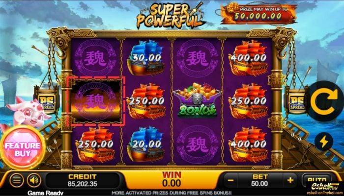 PS Super Powerful Slot Game by Playstar, features vibrant blue and red ships as its main symbols on a classic 5x3 reel layout. maximum win 1,000x.