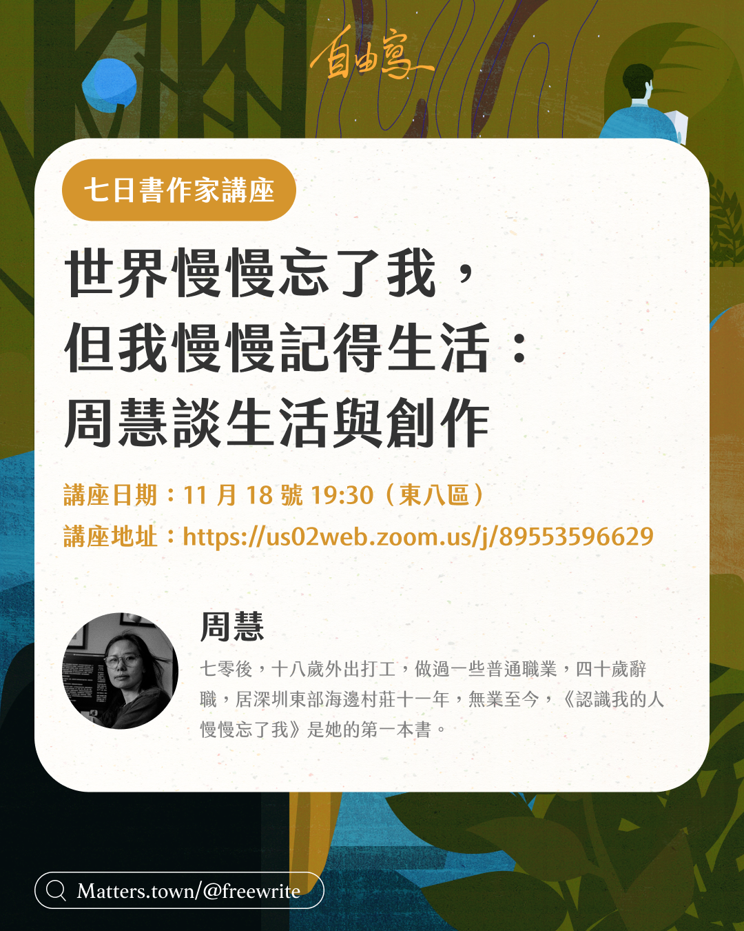 「重構生活」七日書經已結束,今次總共有 185 位文友參與,並歡迎其中第一次參與的 76 位作者。在這個旅程中,大家寫下人生中的重構生活故事,當中包括反思當下、重整步調,繼而再出發。11月18日(二)晚上七時半(東八區),作家周慧將透過作品《《認識我的人慢慢忘了我》,分享她四十歲之後離開都市、搬往鄉村的生活日常,並談及這個過程中的重構經驗。