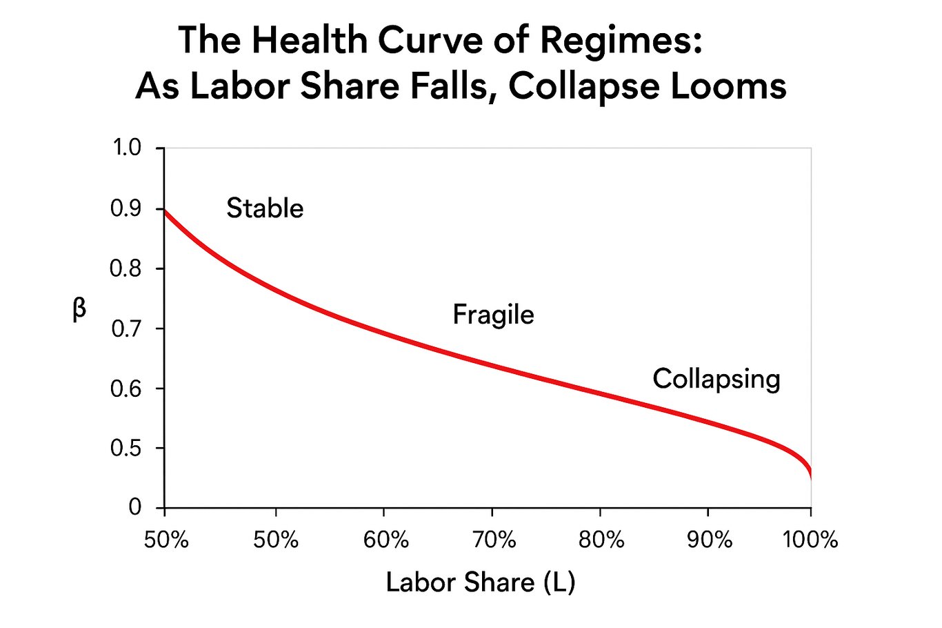 理论上的社会主义应实现 100% 劳动分配,但现实中却长期停滞在 55% 左右。当国家机器代理劳动者,分配权就异化为权力链。劳动占比的每一次下降,都是制度合法性的自我掏空。本文通过比较各国劳动报酬率与合作社市场经济上限,并结合“结构崩溃系数 β”公式,揭示分配比例与政体稳定之间的深层逻辑。