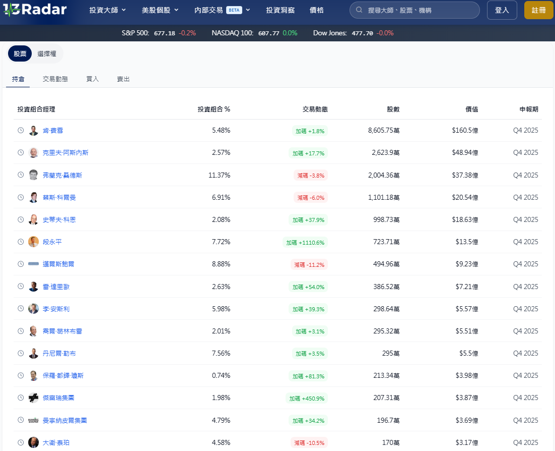 當全世界都在緊盯輝達(Nvidia, $NVDA)的股價波動時,真正聰明的投資者已經開始研究那些「投資大師」們的 13F 持倉報告了。輝達不僅僅是一檔股票,它已經成為 2026 年全球 AI 產業的定海神針。但問題來了:現在進場是「接刀」還是「上車」? 透過觀察最新的輝達大師交易紀錄,我們可以發現,頂尖對沖基金經理人對這家半導體龍頭的看法正出現有趣的兩極分化…
