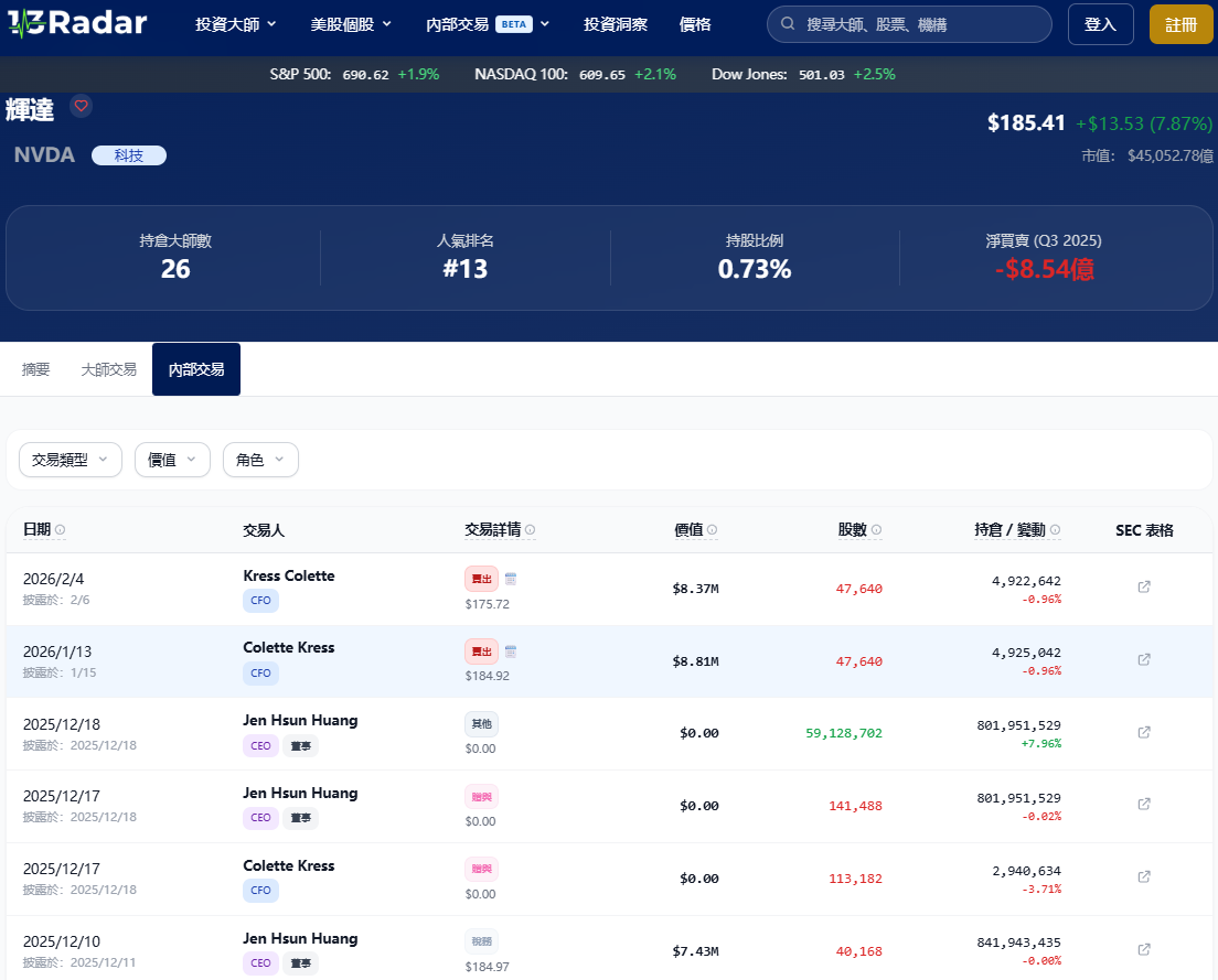 在人工智慧(AI)浪潮中,輝達(NVIDIA, NVDA)無疑是全球投資人的心頭好。然而,當散戶還在熱烈討論 Blackwell 晶片何時出貨、股價何時突破新高時,最了解公司內部動態的高層們卻頻頻傳出減持消息。究竟這波輝達內幕交易潮,是在暗示股價已見頂,還是單純的理財操作?身為投資人的你,必須讀懂這些數字背後的意義。 深入剖析輝達內幕交易:高層真的在落跑…
