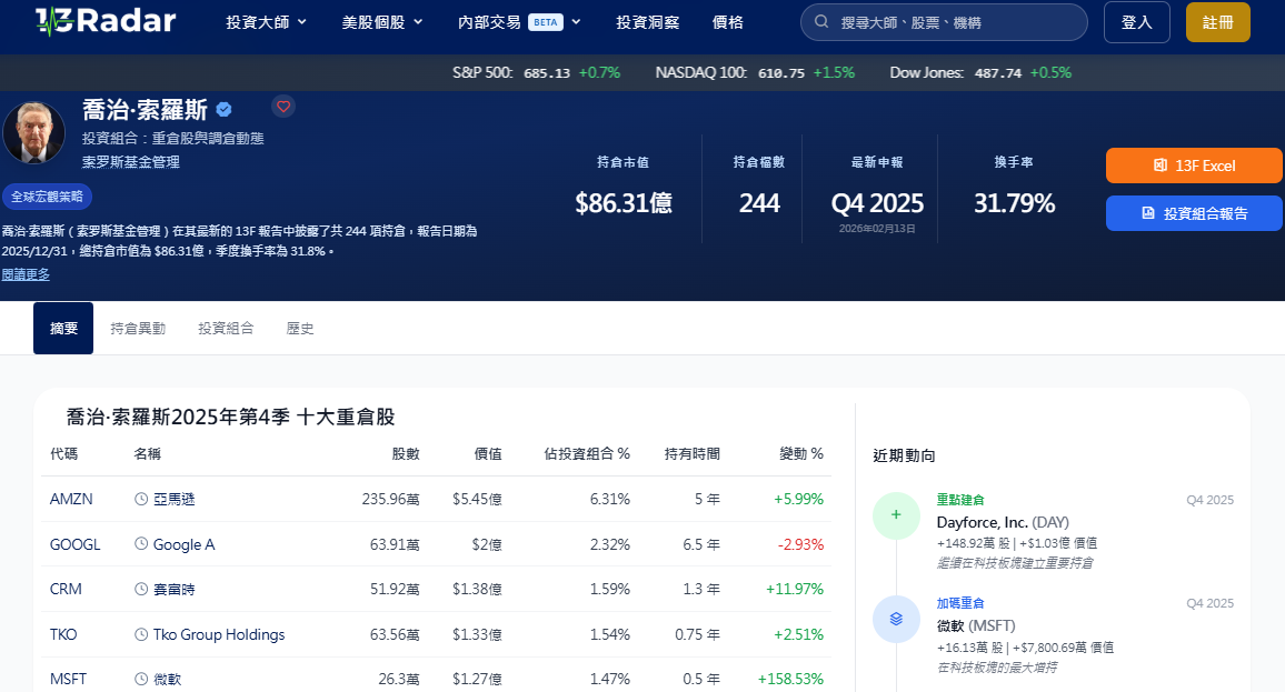 說到全球金融市場最讓人聞風喪膽的名字,喬治·索羅斯(George Soros)絕對榜上有名。這位高齡 90 多歲的傳奇操盤手,每一次的持倉變動都被視為市場轉折的預告。 根據最新披露的 2025 年第四季 13F 報告,索羅斯基金(Soros Fund Management)的動作相當精采:在縮減整體規模的同時,他卻反手加碼了數家科技巨頭。如果你想知道「聰明錢」正往哪裡跑,這份索羅斯持倉名單…