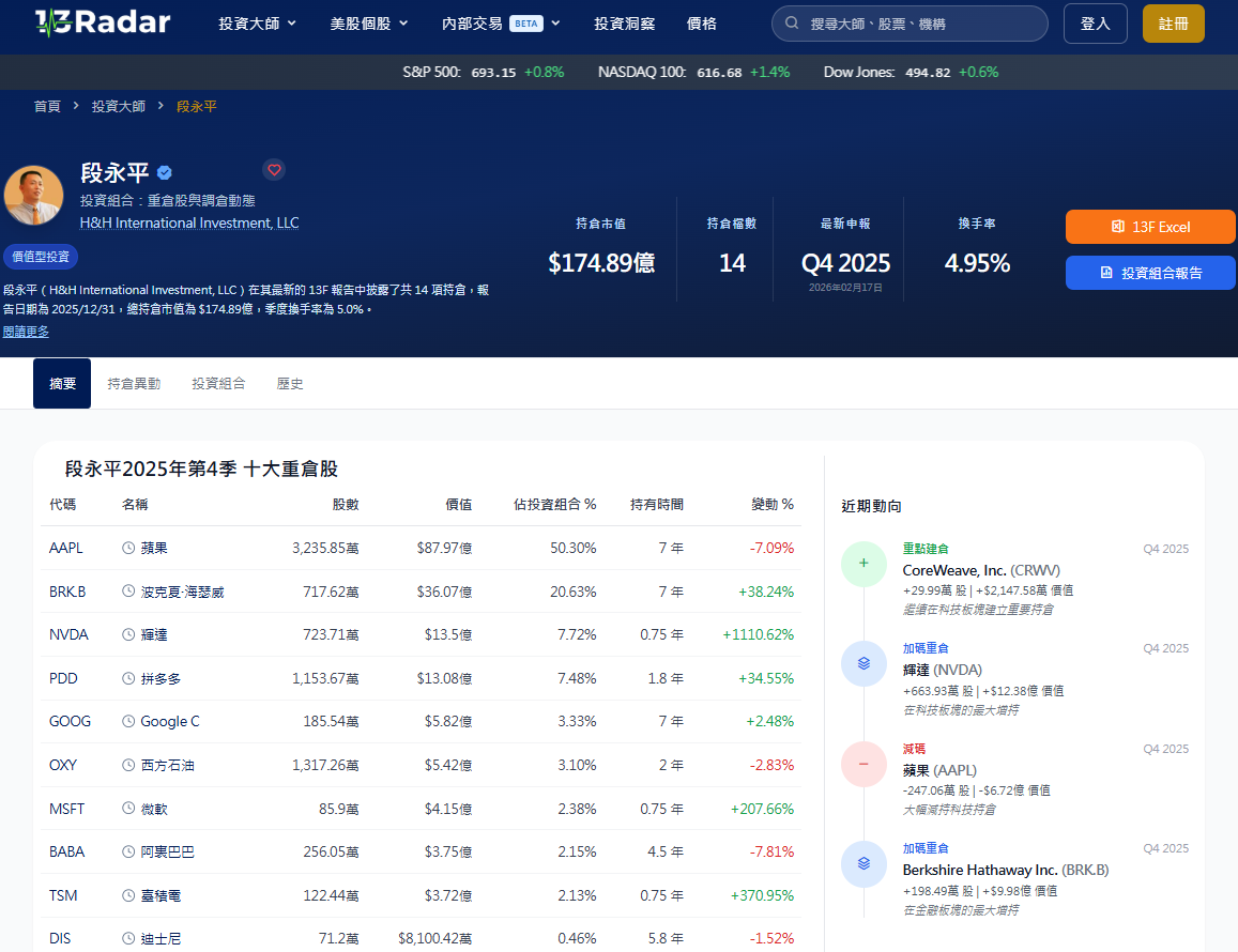 在投資圈,有一個名字只要一出現,總能掀起討論熱潮,那就是被譽為「中國巴菲特」的段永平。他不僅是步步高與 vivo/OPPO 的幕後推手,更是價值投資的忠實信徒。近期,由他掌管的 H H International Investment 提交了最新的 13F 文件,揭露了超過 170 億美元(約台幣 5500 億元)的驚人佈局! 蘋果還是真愛嗎?段永平持倉大洗牌 說到段永平持倉,大家第一個想到的絕對是蘋果(Apple)。自…