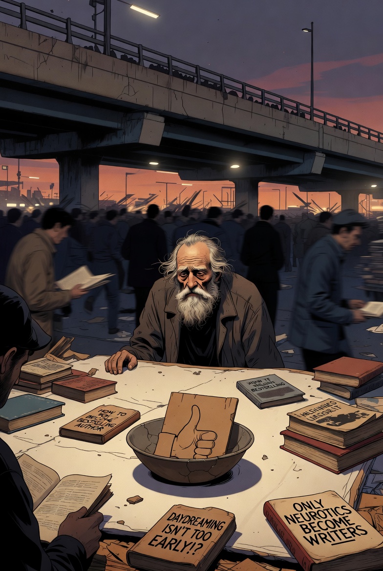 隱在天橋上行色匆匆的人潮中,某個不起眼的角落裡,有一個邋裡邋遢不修邊幅的瘦弱老頭,他趁著日頭西下的昏暗,就在男女老幼趕著回家的時刻,默默的在天橋上擺起書攤來;這個書攤充其量不過是在地面上鋪個帆布,帆布上再擱些零散的書本,實在簡陋的很。 奇怪的是他既不吆喝也不叫賣,矜持著不為五斗米折腰,用冷眼看著眼前的一…