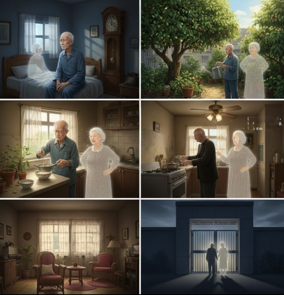 距離時鐘預定鈴聲的響起尚約有兩個小時,老先生早已起床坐在床沿邊無神凝望著窗外。 「我知道,現在還很早,但是我左右就是睡不著嘛,在床上翻來覆去的又怕吵到你。」老先生說。 直到黎明乍現,老先生不再說話,像任人擺飾的布玩偶呆呆愣坐在房間的一角。 隨著天色漸漸明朗,窗外院落的植栽綠意盎然映入老人的眼簾。他起身到浴室盥洗,這…