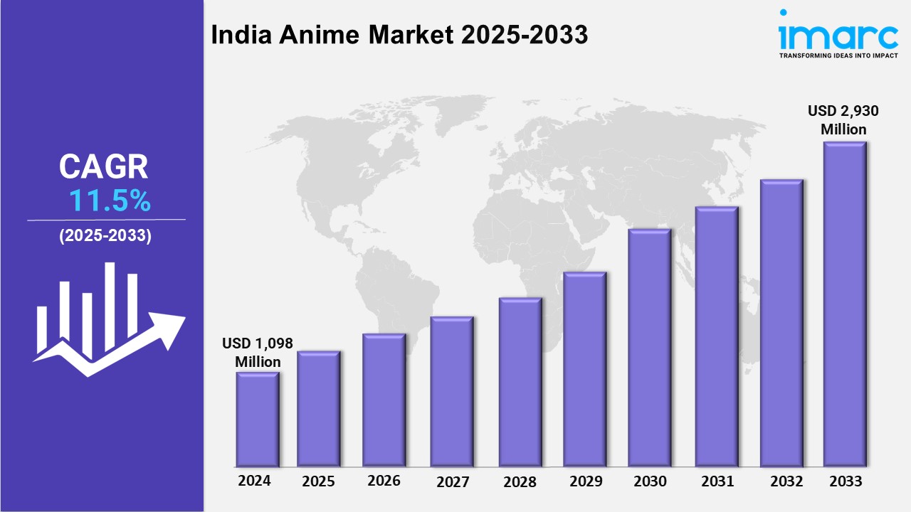 The India anime market size was valued at USD 1,098 Million in 2024 and is expected to reach USD 2,930 Million by 2033, exhibiting a growth rate (CAGR) of 11.5% during 2025-2033.