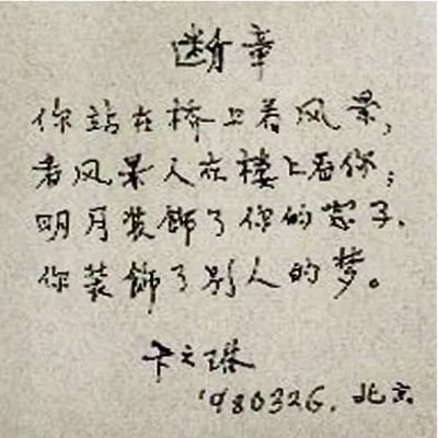 從卞之琳〈斷章〉中,有人悟到「裝飾」兩字所帶來的人生悲劇意義,也有人讀出了一段苦戀的故事,卞之琳自己則強調詩中的「相對」精神,但從拉岡的視角你將會看到大他者的〈凝視〉。 〈斷章〉開篇的兩行: 你站在橋上看風景,看風景的人在樓上看你。 這兩行詩看似對稱、簡單,卻隱含深刻的主體與他者的哲學道理,觀看與被觀看的關係,看似互為主客體的視…