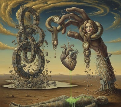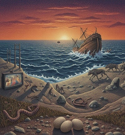 血絲沿著繩索從橋上縋下熟悉的面孔 斑駁的淚痕佈滿在昔日興奮的縐褶內 一浪浪的喧吠聲從陌生的電視傳來 荒誕的現實演出在百年虛幻的土地上 古老的蛆蟲吸吮強健的借來的肌肉 腐爛的味道引領一群土狼追噬著善良 貪腐的強盜掠奪久遠不屬於他們的債 碩大的船身沉沒在無聲的喧譁與騷動中 越過高牆爬上桅杆眺望遙遠的…
