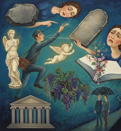 妳指著天上的石頭說是堅硬的豆腐 我說我是棲身於卡布里島上聶魯達的郵差 妳嘴唇熱情吐出陌生化的面容 我手指觸摸到一股久遠來自阿佛洛狄忒的味道 妳彎起嘴角絕望地將魯迅的石碑擲向我 我在盛載花朵的詩篇上抄寫著思慕的名字 妳咀咒塞在口腔中歌唱著兒童的繆思 我迷失在狄奧尼索斯的葡萄園中 並著身軀在暴雨的傘…