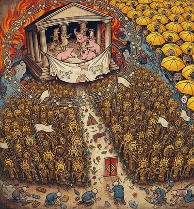 高奏E大調第九號交響曲灌滿回歸的耳腔 頭顱上的太陽烤著等待燃燒的蘆葦 廟堂上群狗圍著群豬興高采烈地跳上跳下 圍牆內稻草擠著稻草沒有一點空隙沒有一點聲音 裸露的無知之幕上演著農莊的劇本 腳底下的花朵踐踏出不是門的道路 不潔的桿子上插著不能說的旗幟和豬頭 連至天邊的黃傘蓋不住無數憤怒的吶喊 他們高舉…