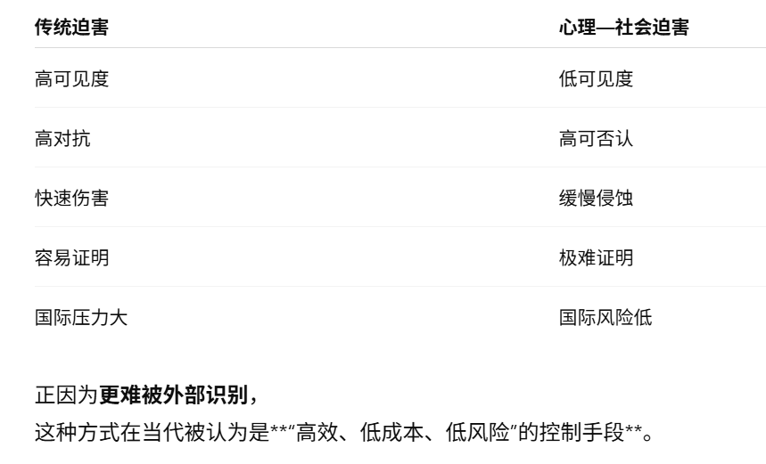 一、概念源头:从“酷刑”扩展到“心理—社会迫害”1️⃣ 从身体暴力 → 心理暴力的转向 在冷战后的人权法发展中,一个非常重要的转变是: 迫害不再只等同于“关押、殴打、肉体酷刑”,而是包括“对人格、认知与社会存在的系统性摧毁”。 这一转向,明确写入了多个人权与难民保护框架中,尤其体现在联合国难民署 的解释性文件与实践裁量中。 二、三种被正式承…