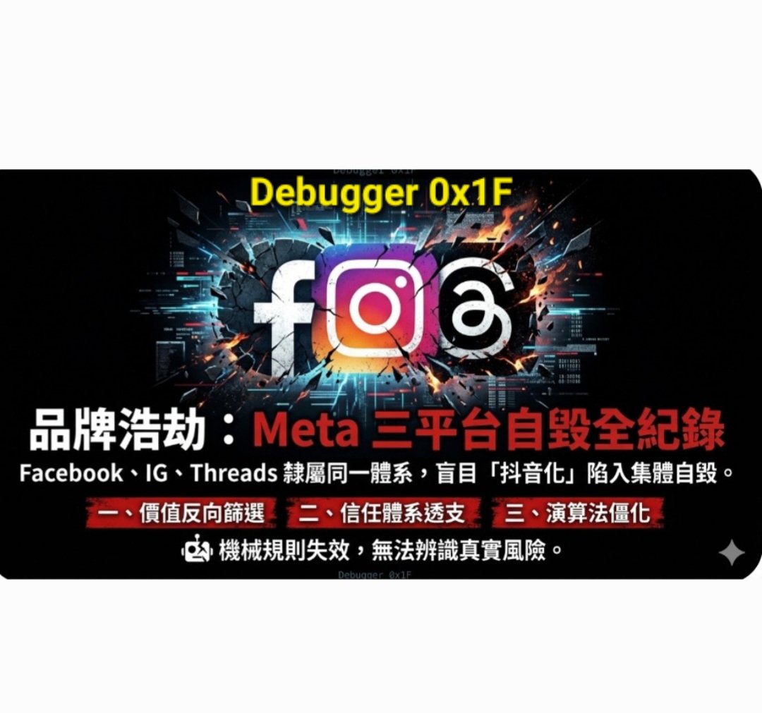 【品牌浩劫:Meta 三平台自毀全紀錄】Facebook、IG、Threads 隸屬同一體系,正因盲目「抖音化」陷入集體自毀。Debugger 0x1F 深度拆解三層崩壞邏輯:價值反向篩選:高品質內容邊緣化,詐騙與低質流量霸凌生態。信任體系透支:以虛假焦慮與驗證程序強掠隱私權。演算法僵化:機械規則失效,無法辨識真實風險。這不只是轉型,而是一場透支未來的品牌浩劫。