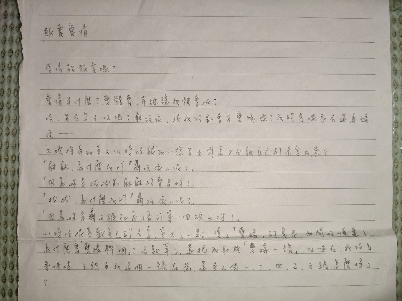 青春時期,於交換日記上書寫的作品。 2004/02/16至2004/03/29間書寫完成。 [01]座位 風……輕輕吹拂在臉上,髮……隨風飄逸,心……在何方…… 想他?嗯,沒錯,正是想他! 唉……想他想的心好酸、好疼、好難過……淚水……從兩頰邊滑落…… 突然眼前多了隻手,手心上是捧著一條手帕,我抬頭,看不清「他」是何人,因為淚水……已模糊了我的視線,但我知道給我手帕的是一名男士…… 我接過,拭淚,嘴裡說的…