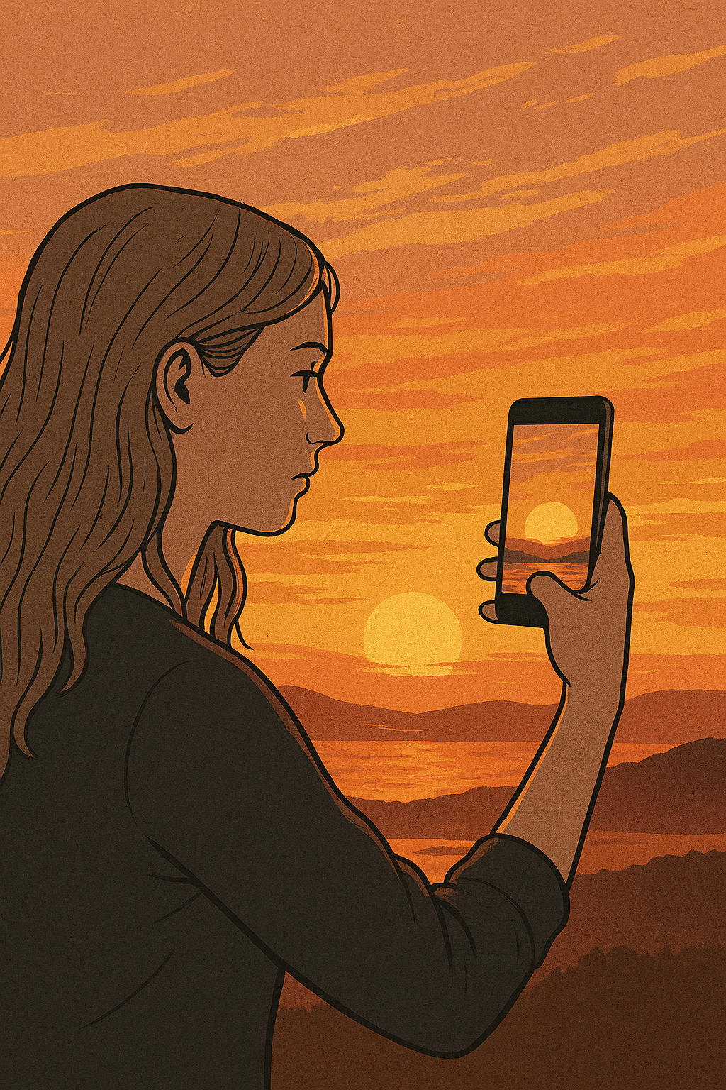 傳說看見分身意味死亡,而現代人卻心甘情願把靈魂交給螢幕裡的數位二重身。我們在現實採集素材,只為餵養網路上更完美的自己;久了,帳號開始決定我們的喜好、行為與身份。斷網時的不安,是分身短暫死亡、我們被迫回到空洞的身體。在按下快門前問一問:看風景的是我,還是那個「他」?