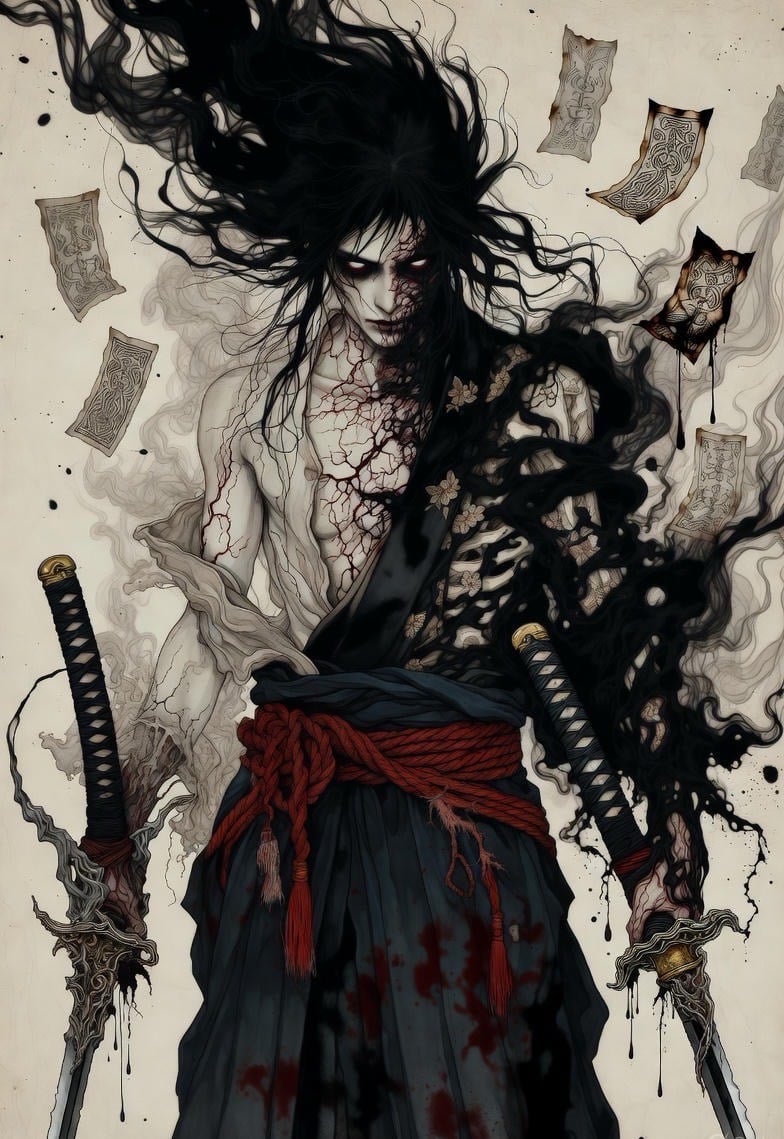 血月濃霧,鹽脈泉眼第七夜。十二殘兵背聖泉,面對無盡鹽裔狂潮。副首領殘夜半身碎裂、半身化墨,終鬆刀,任黑霧吞手。「家園不可滅。」雙妖刀猛插大地,紅繩血蛇絞緊。《冥獄契》啟,黑煙炸開,冥力灌體。武士之軀與閻羅之力融合。殘夜換山海界一勝,亦換自身永墮。