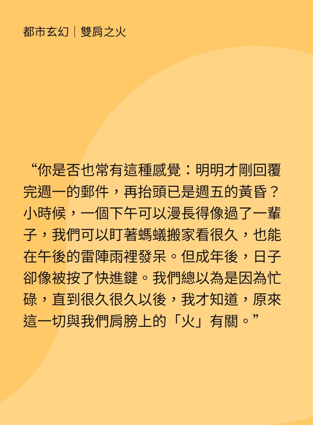 你是否也常有這種感覺:明明才剛回覆完週一的郵件,再抬頭已是週五的黃昏?小時候,一個下午可以漫長得像過了一輩子,我們可以盯著螞蟻搬家看很久,也能在午後的雷陣雨裡發呆。但成年後,日子卻像被按了快進鍵。我們總以為是因為忙碌,直到很久很久以後,我才知道,原來這一切與我們肩膀上的「火」有關。