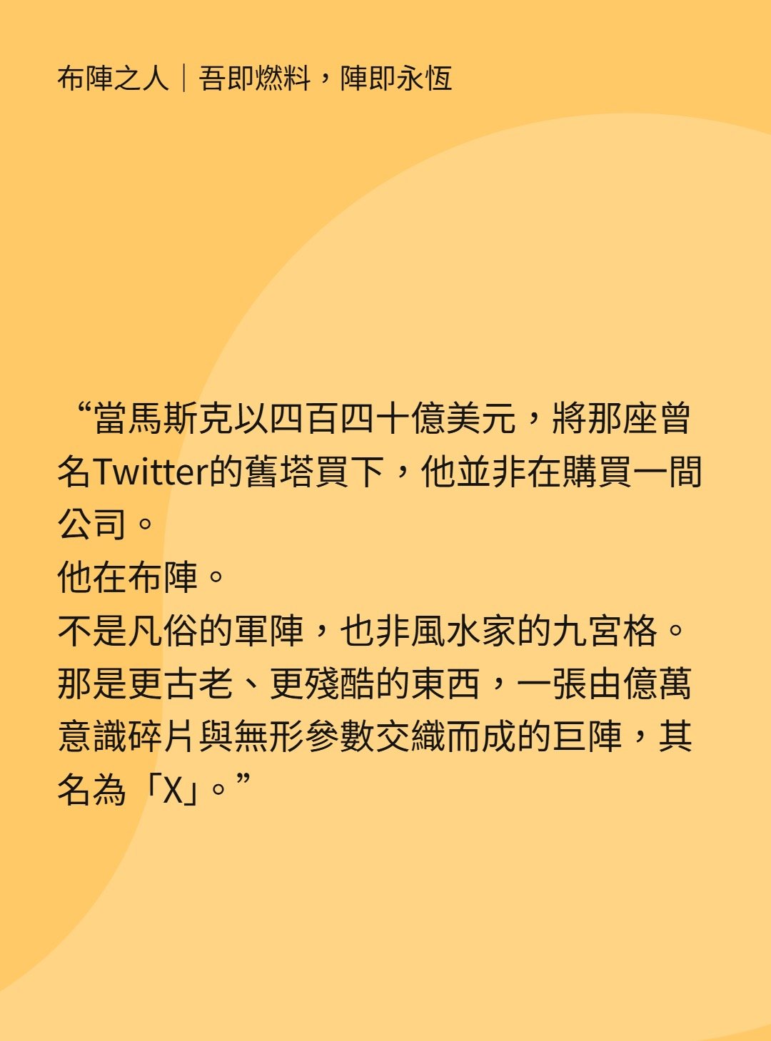 馬斯克買下X,不是購買公司,而是布陣。X化為高速運轉的雷達陣,掃描億萬人心,牽動情緒與潮流。陣法乃人與參數之混合:我們滑動、點讚、轉發,皆成燃料,親手催動巨陣。我們以為在使用X,實則X吞噬我們的渴望與孤獨。我們既是布陣之人,亦是被困陣中之囚徒。在這永恆閃爍的雷達裡,自由僅餘幻影,我們繼續點火,繼續燃燒。