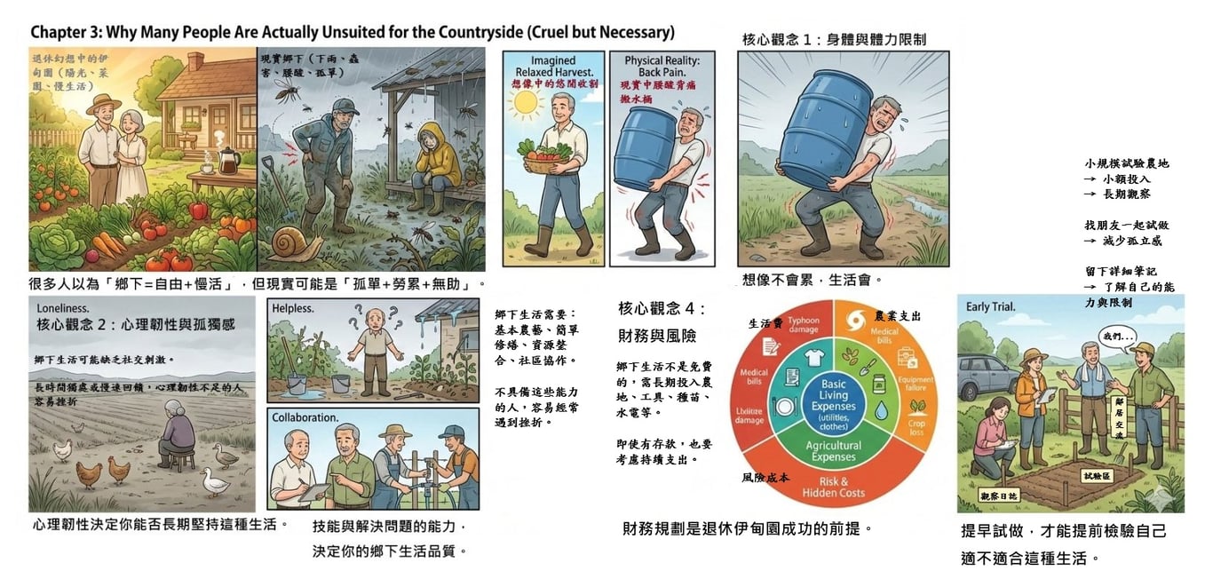 退休後,你夢想的伊甸園可能是慢生活、清新空氣、健康蔬果與悠閒節奏,但現實往往比想像複雜。本書將帶你認識鄉下生活的真實挑戰——體力負荷、孤獨感、技能需求與財務風險,並提供可操作的方法與策略。透過小規模試做、資源整合與逐步投入,你能提前檢驗自己的能力與資源,掌握可持續生活的方法,讓你的伊甸園不只是夢想,而能真正落地…