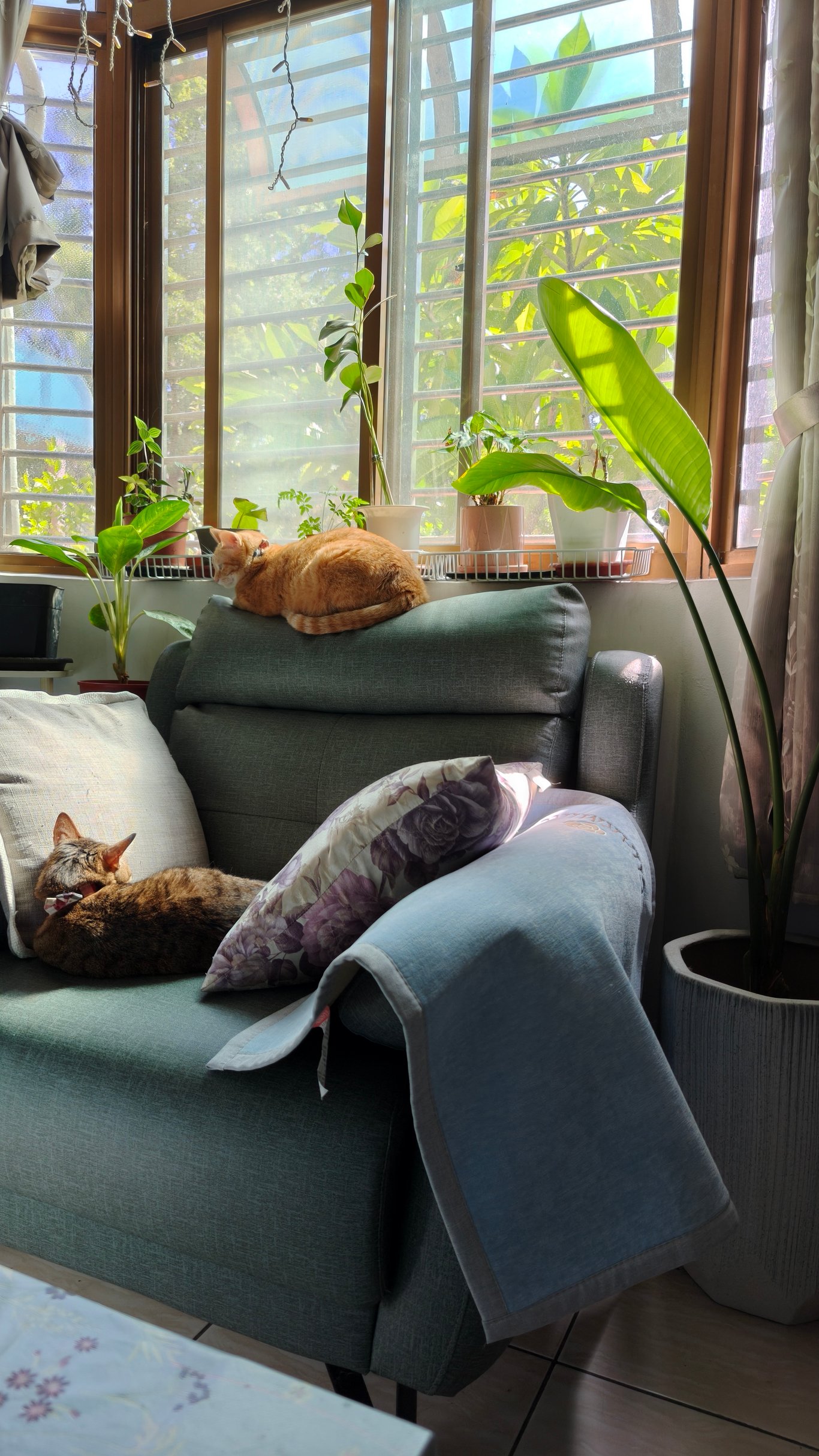 心煩時,或不想多思考的時候,我多半會藉由睡覺來逃避想起煩心或陷入憂鬱的事。 最近的我常常在空閒的時候躺在床上,試圖讓自己睡著,這樣的天氣當然也是想睡的原因之一。 除了我被吸引到床上外,我家貓咪也被吸引上了床,在床上形成一幅有趣的畫面。我與我家比比同時都躺在床上睡覺,牠依偎著我,我則是側身讓牠靠著,就這麼雙雙…