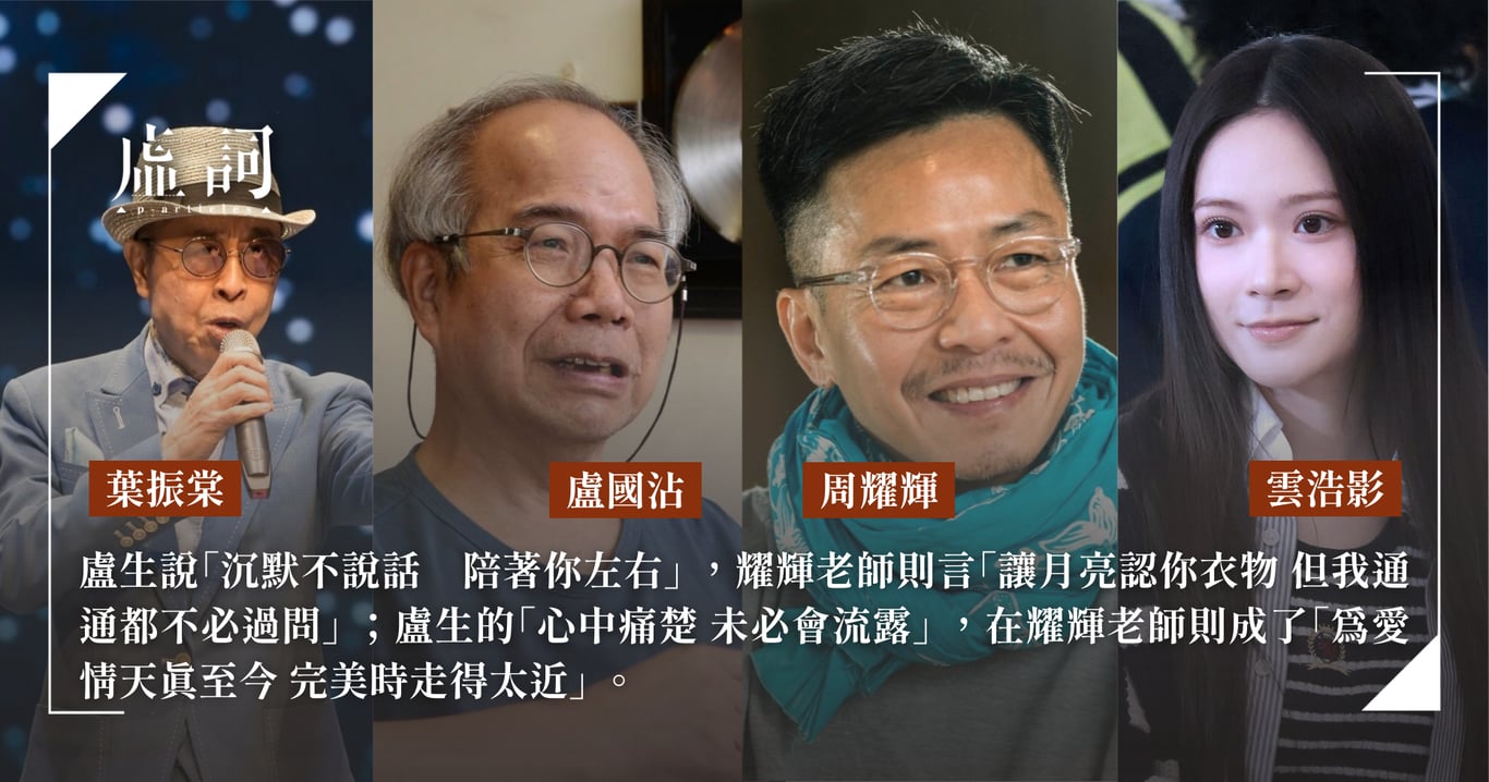 盧生說「沉默不說話 陪著你左右」,耀輝老師則言「讓月亮認你衣物 但我通通都不必過問」;盧生的「心中痛楚 未必會流露」,在耀輝老師則成了「為愛情天真至今 完美時走得太近」。