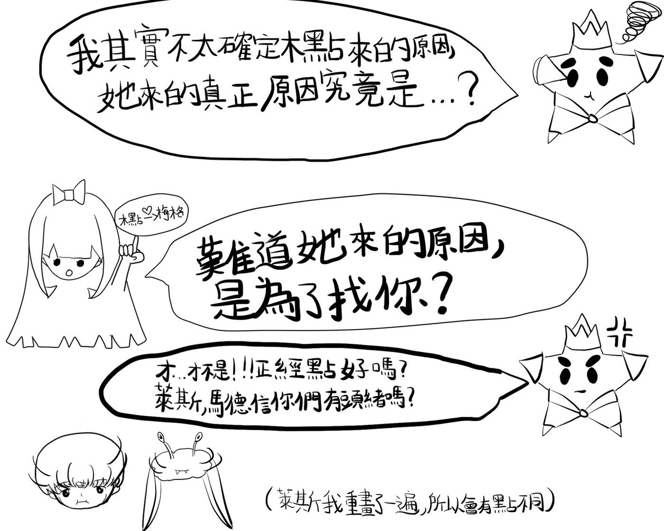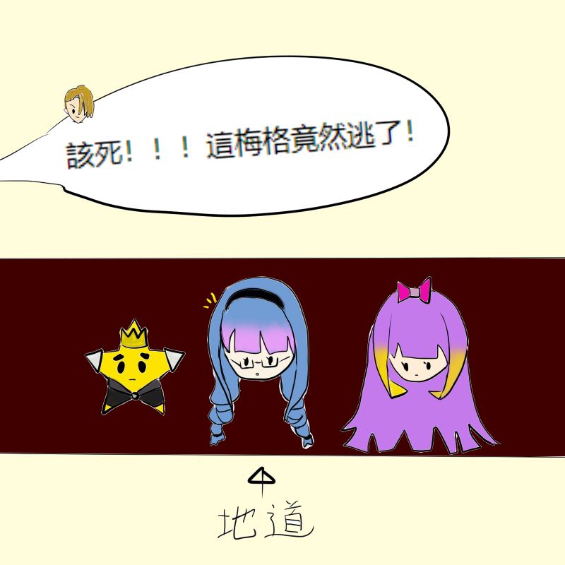 第十五集 —— 出發去「流星」 月寧和樂兒看見的梅基跟剛剛的影像一模一樣,不過是抱著一顆星星,而那星星並沒戴著頭套,只綁著雙手,閉著眼睛,應該是昏迷了。「梅格!他拉著梅格!梅基拉著梅格!!!」月寧激動地尖叫,並拿起旁邊的一塊尖木板。「你先冷靜,別這麼激動。