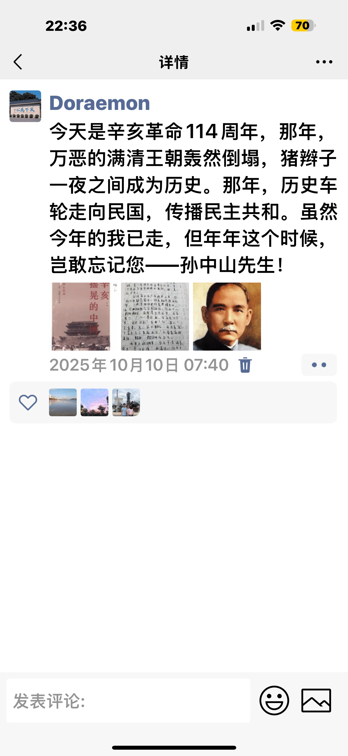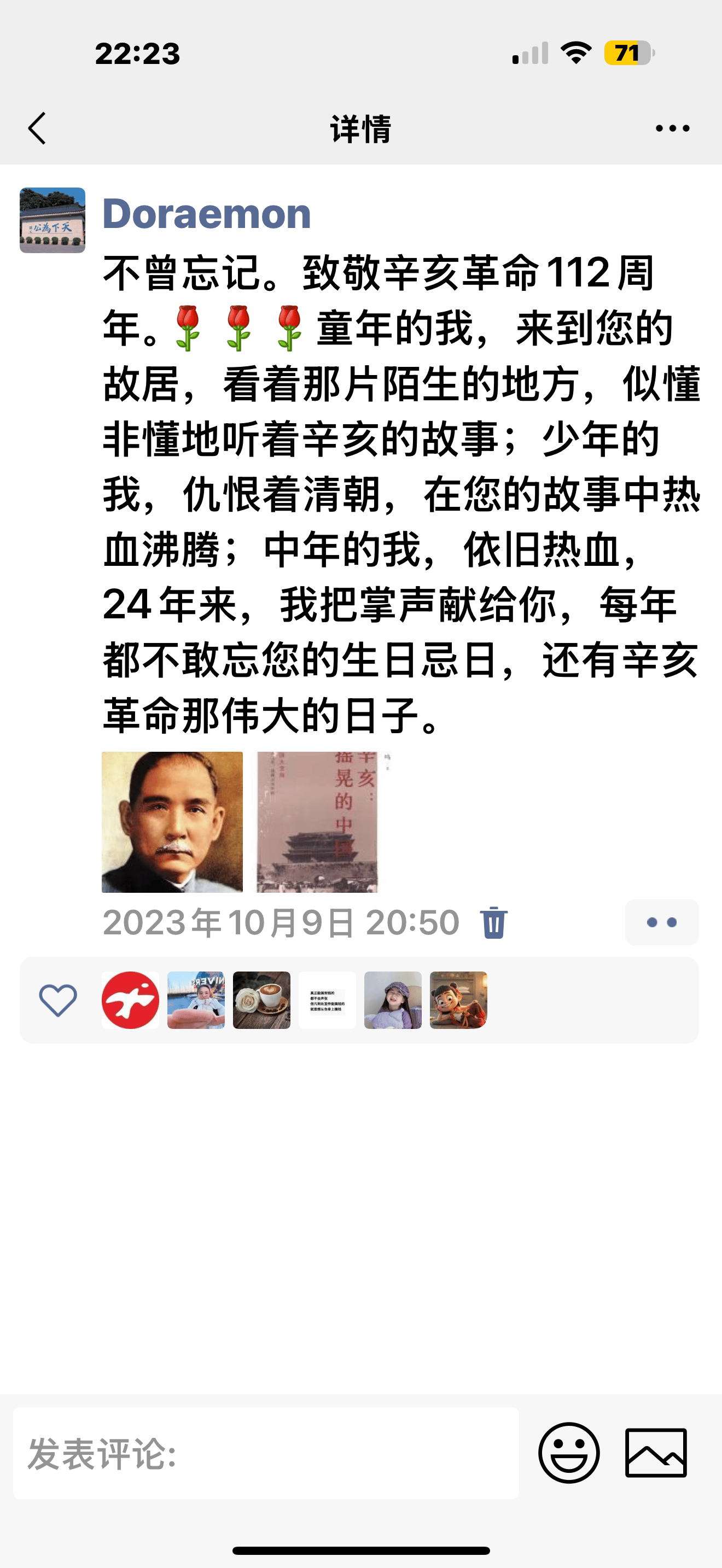 中国时间,还有两天就是植树节了,3.12也是孙中山先生的忌日,在我心目中,他是华之伟人。每年辛亥我都记得。这几天看了立春日因为那篇bully文章(深名校,从精神绞杀到性侵的1/4世纪 ),喜提一名小十几岁的校友🥸他给我发了某些黄埔军校视频,要我想起了中山先生的忌日将近。他家世很好,家父出生于大家族,祖父与祖母的家族均在开国,抗战,改开中做出贡献。听他讲历史,我挺云里雾里,但觉得历史就在身边。