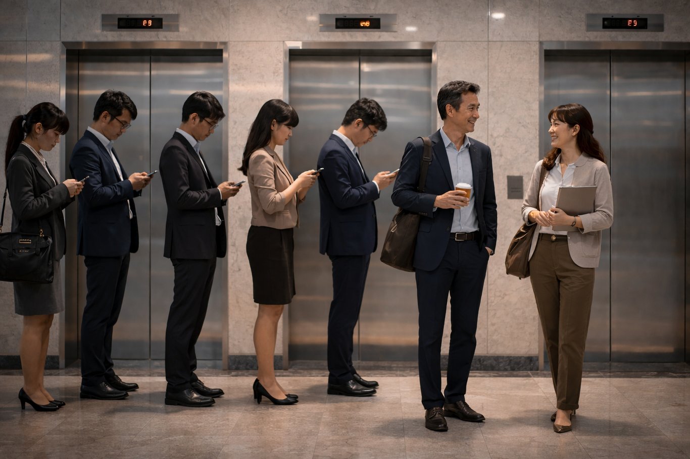 在鋼鐵與玻璃交織的商辦大樓裡,生活總是被切割成精確的刻度。早晨的電梯大廳,是大理石鋪就的無聲戰場,每個人都低頭凝視著手機螢幕,或是面無表情地盯著上方跳動的樓層數字。在這種講求效率的空間裡,人與人之間保持著一種禮貌而疏離的真空狀態,我們像是設定好軌道的行星,在冷冰冰的秩序中急促運行。 然而今天,這份規律被…