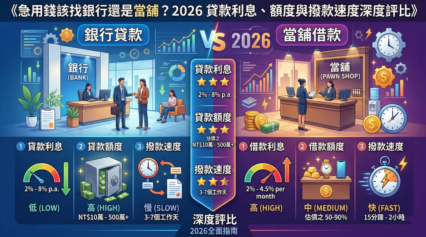 急用錢該找銀行還是當舖?2026 貸款利息、額度與撥款速度深度評比