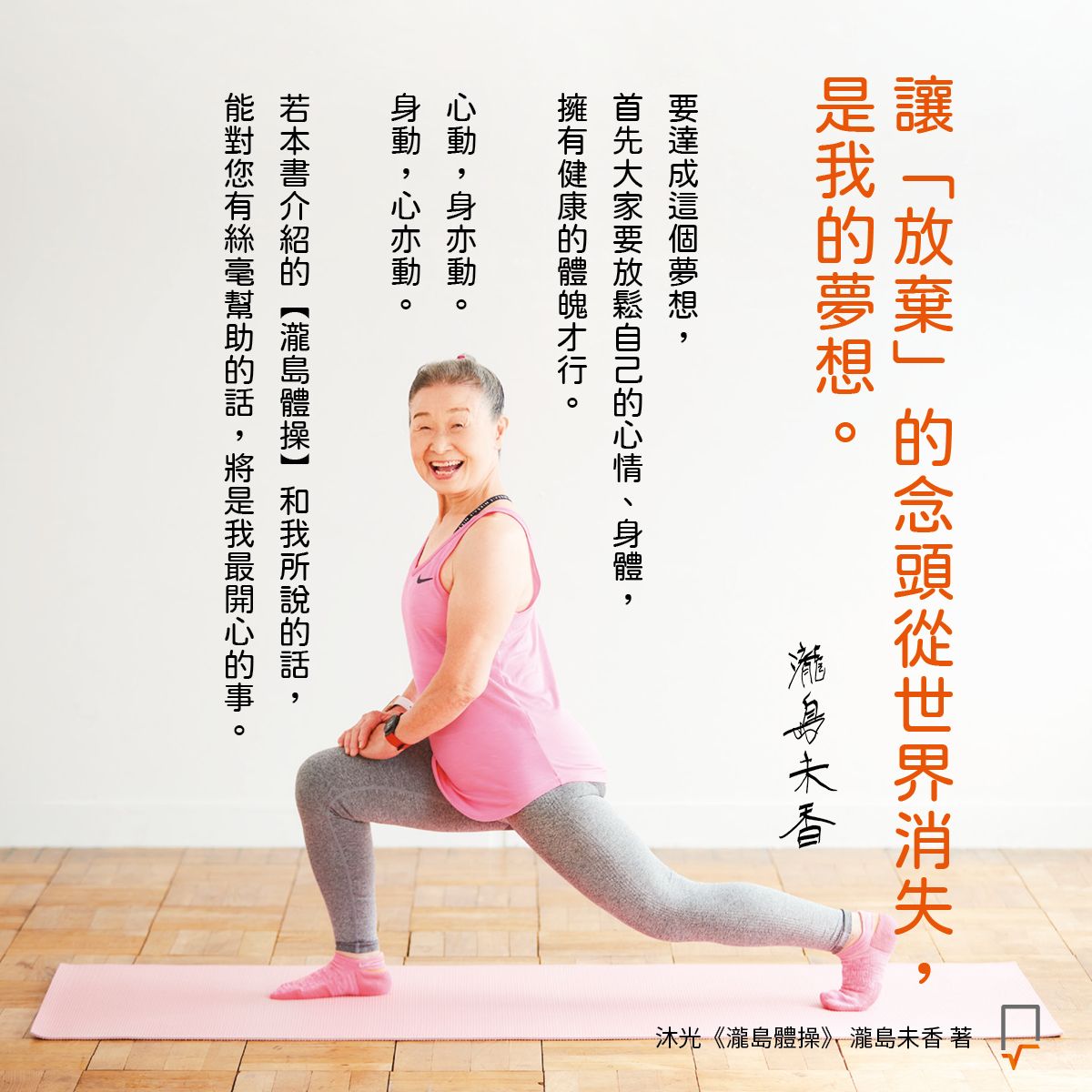 這本書不只適合所有中高齡沒有運動習慣的人可以閱讀,也適合所有腦子卡住的中年、青年們看:不要擔心啊!人家瀧島65才開始運動,70好幾才學會游泳,沒有什麼事是做不到的,趕快起身吧!