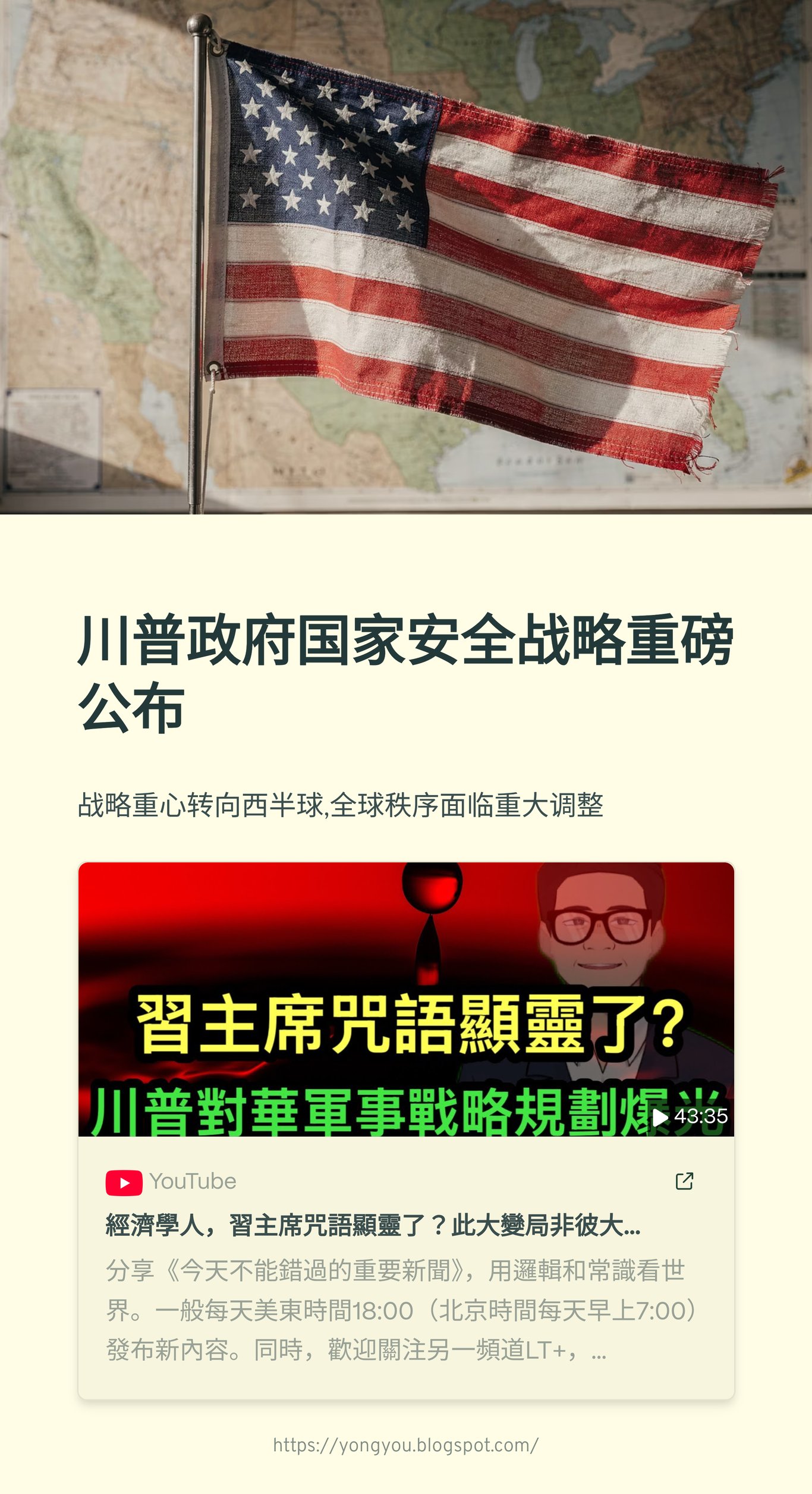 *摘要:** 12月5日,白宫正式公布了推迟已久的川普政府《国家安全战略》报告。这份文件不仅是对“美国优先”外交政策的终极阐释,更标志着二战后美国建立的国际秩序将迎来最为深刻的调整。从战略收缩至西半球,到对欧洲盟友的严厉通牒,再到对华政策的“经热军冷”双重面孔,川普政府正在以一种“灵活现实主义”重塑世界格局。https://yongyou.blogspot.com/2025/12/125…