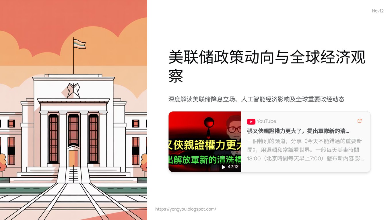 2025年11月12日要闻整理:美联储内部对12月降息的分歧与三大争议点、AI导致企业缩减招聘的观点、特朗普相关重大新闻、丰田美国混动投资、双十一消费回落与中国政坛要闻等深度解读与要点速览