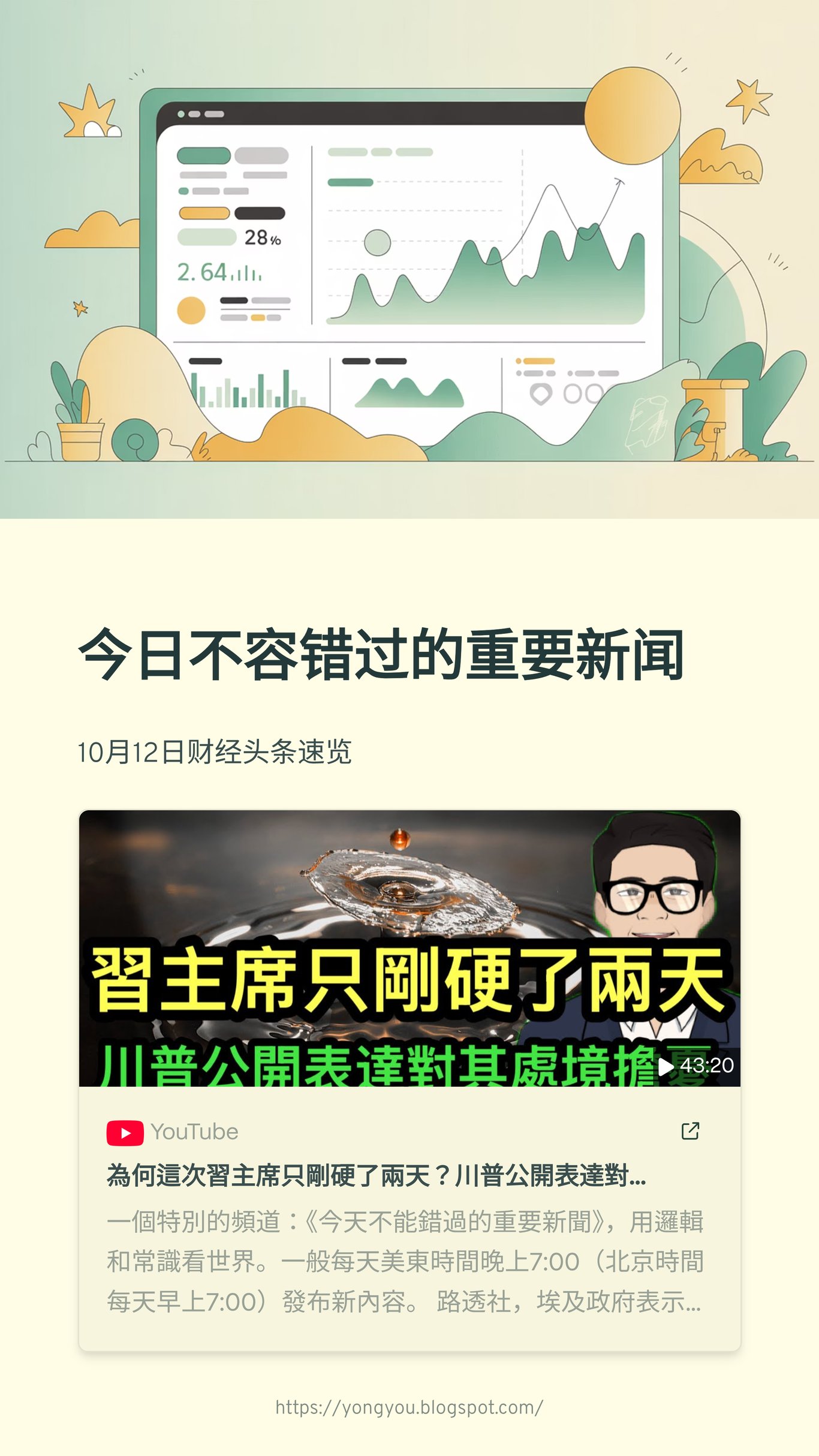 本周全球市场风云变幻,一系列重大事件不仅重塑了国际关系格局,也为未来经济走向带来了深刻的不确定性。从中国出人意料地升级稀土出口管制,到日本执政联盟长达四分之一个世纪的合作关系骤然破裂;从委内瑞拉反对派领袖荣获诺贝尔和平奖,到中东和平进程迎来微妙转机。每一事件背后,都交织着大国博弈、经济利益与意识形…