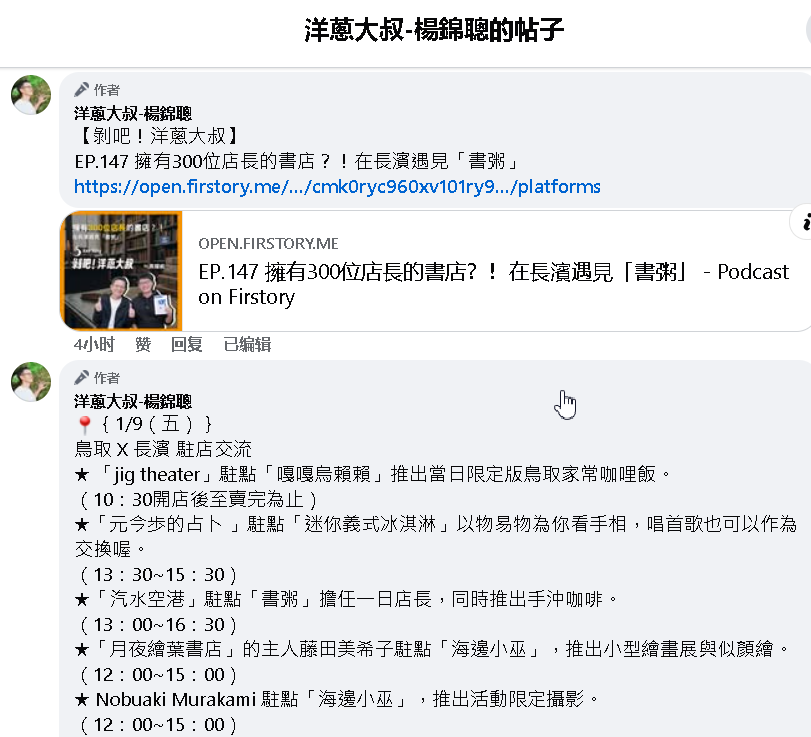 很喜歡,也經常去長濱,特別是「書粥」。分享活動資訊 1/9~1/10 鳥取村X長濱村 Super Local Mix 以下是這次鳥取村夥伴為這次活動提出的類似初衷的文字: 「所謂『超在地混搭』,是讓偏鄉與偏鄉之間能夠互相往來,讓彼此的文化相互交融的一種概念。鳥取縣是全日本人口最少的縣,在這個遠離日本中心的偏鄉,許多充滿個性的小店、以及投身創作的人們,紛…
