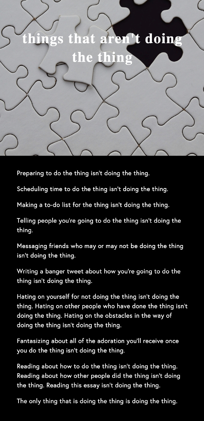 准备去做这件事,不等于在做这件事。把做这件事的时间写进日程表,不等于在做这件事。为这件事列一份待办清单,不等于在做这件事。跟别人说你打算做这件事,不等于在做这件事。给那些可能在做、也可能没在做这件事的朋友发消息,不等于在做这件事。写一条超级精彩的推文宣告你要做这件事,不等于在做这件事。因为自己没做这件事而…