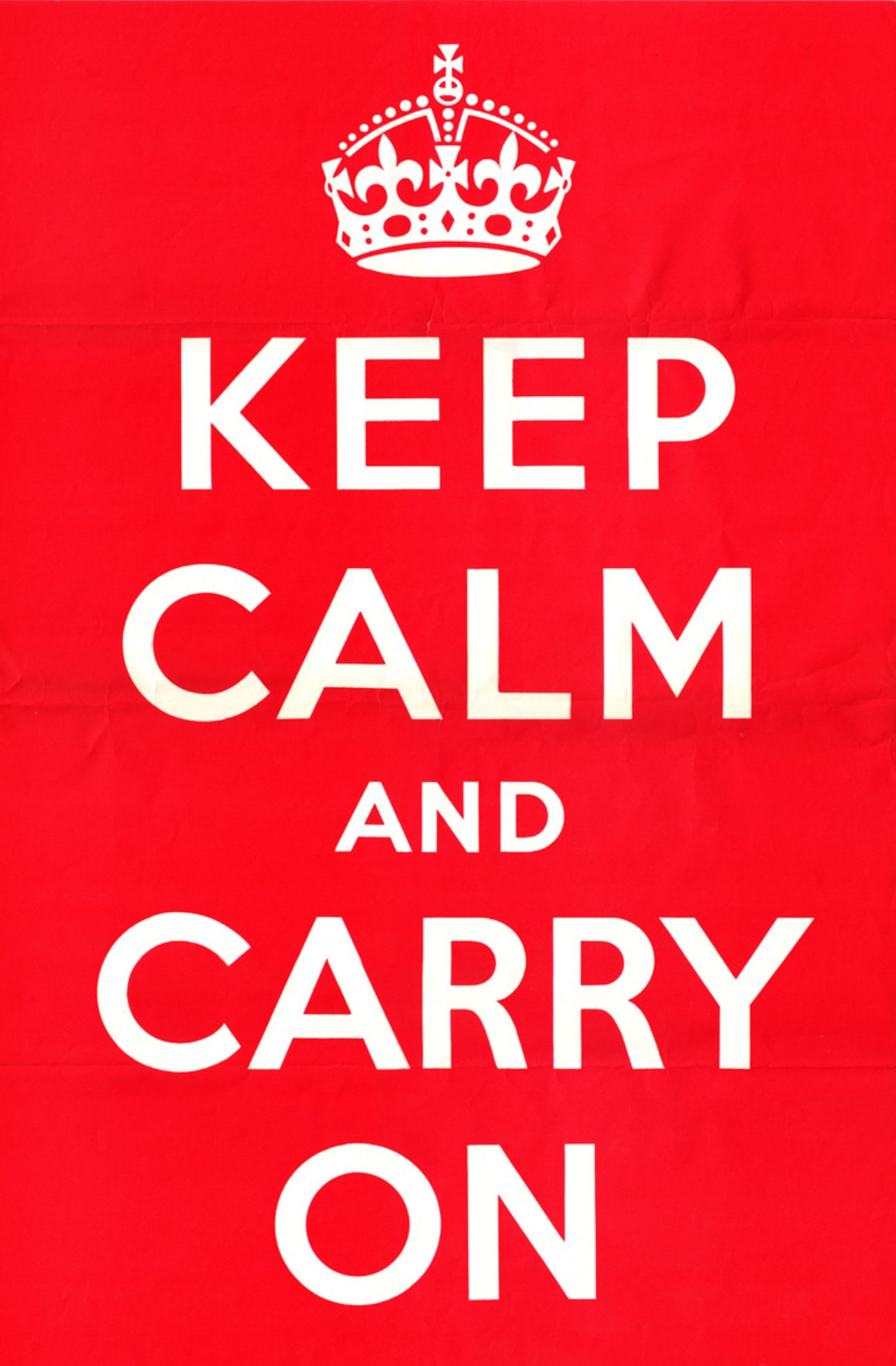 二戰時, 英國政府擔心納粹德國即將空襲倫敦與英國本土,為免民眾恐慌,英國資訊部(Ministry of Information) 決定推出一系列穩定民心的海報。 當年的宣傳海報有3款。 第一款是 “Your Courage, Your Cheerfulness, Your Resolution Will Bring Us Victory” 第二款是”Freedom Is in Peril, Defend It with All Your Might” 第三款的海報就是既簡而精的 “Keep Calm and Carry On” 據說,當年英國政府政府印製了約2,450,000 張 “Keep Calm and Carry On”的海報,德軍雖然空襲…