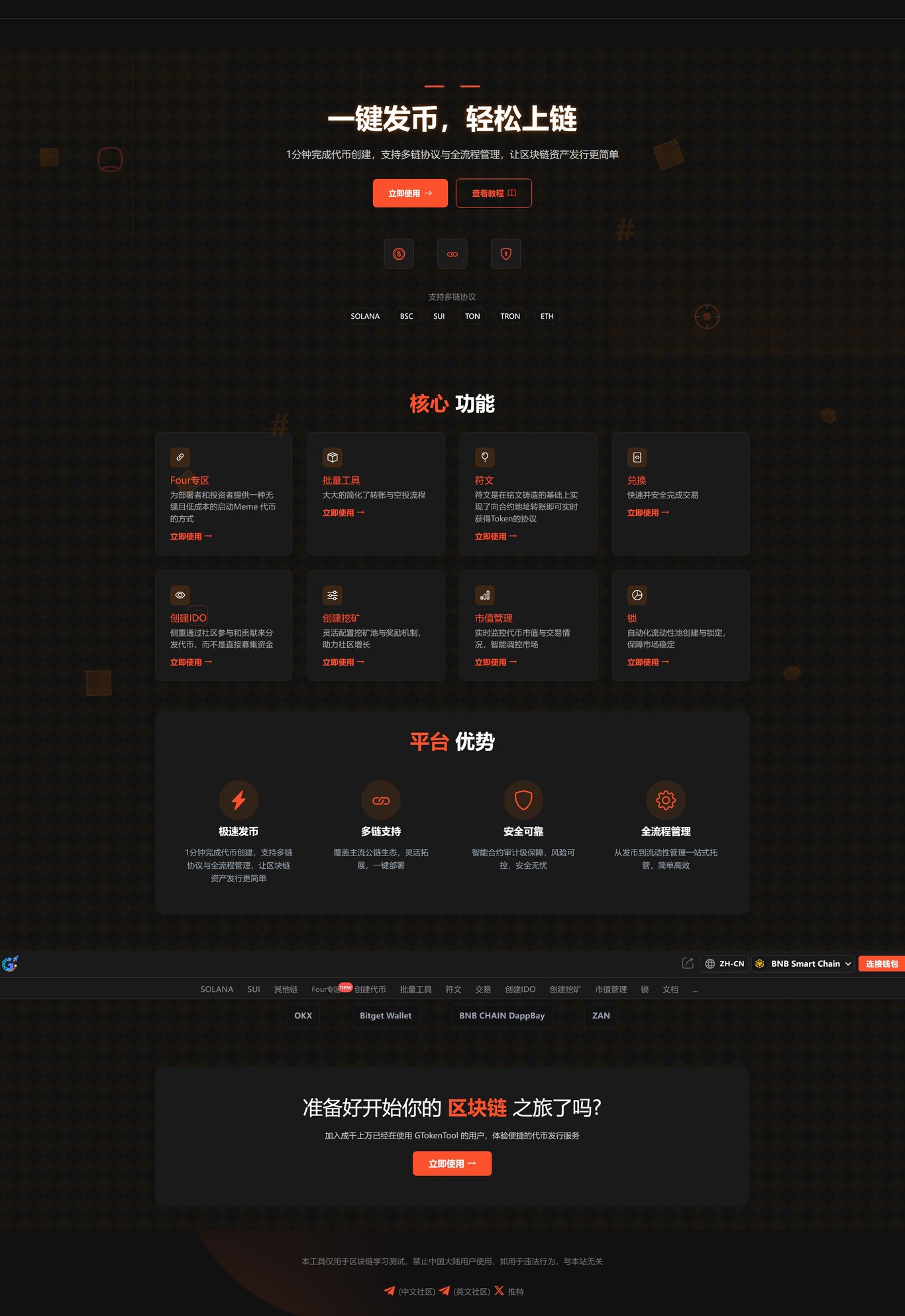 在加密货币世界里,尤其是 Binance Smart Chain (BSC) 生态中,选择一个可靠的发币工具平台极其重要。它不仅是进入 Defi 和 Web3 的起点,更是项目从概念到上线的加速器。GTokenTool 以其安全、简便、低成本与功能全面的优势,正在成为开发者项目方首选的代币创建与管理的解决方案。 一、 GTokenTool 平台简介GTokenTool是功能最全的一键发币工具,支持TON、SOL、BSC等多条公链。功能:创建代币、市…