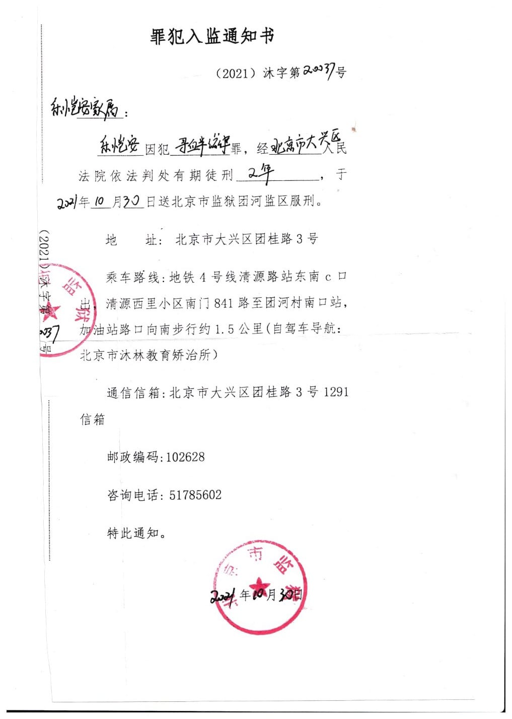 20年我在北京因为政治活动被关进了北京市大兴区看守所,接着后被转到了北京六看,八个多月后又被转回大兴区看守所,终于到了我的审判时间,不久后又被投送监狱......